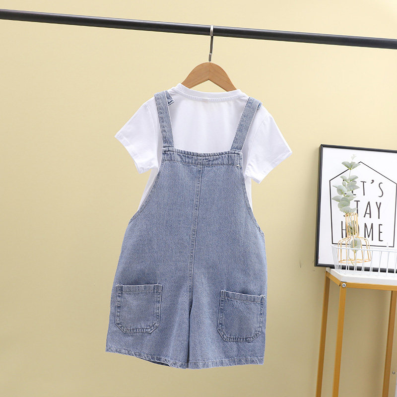 Джинсовый комбинезон, летние штаны, шорты, футболка с коротким рукавом, комплект, подходит для подростков, эффект подтяжки