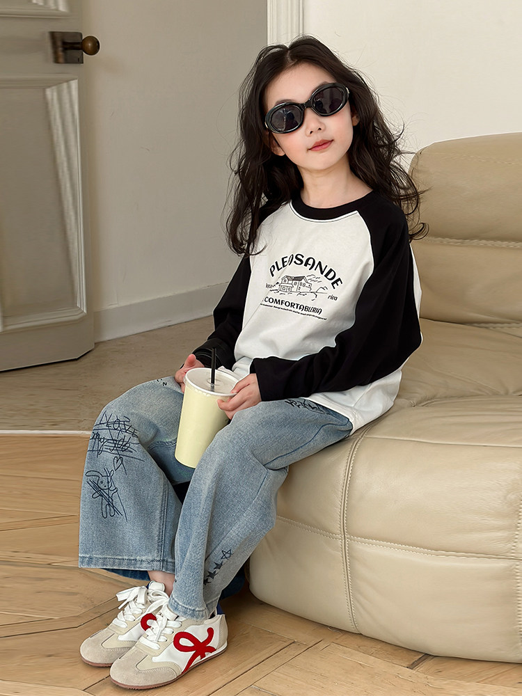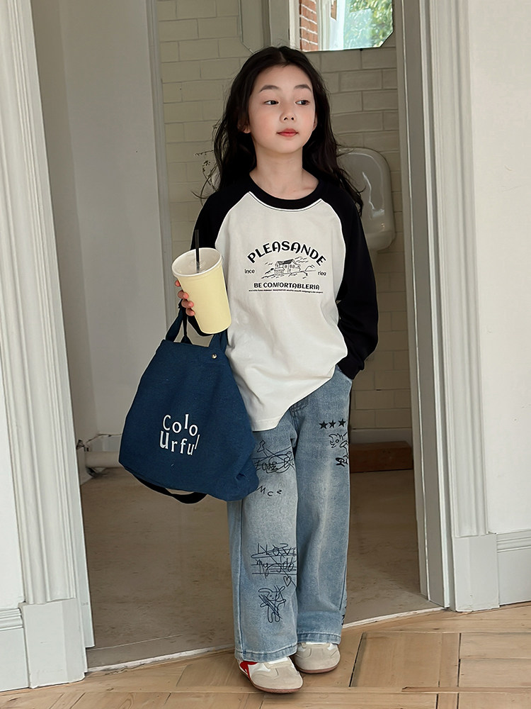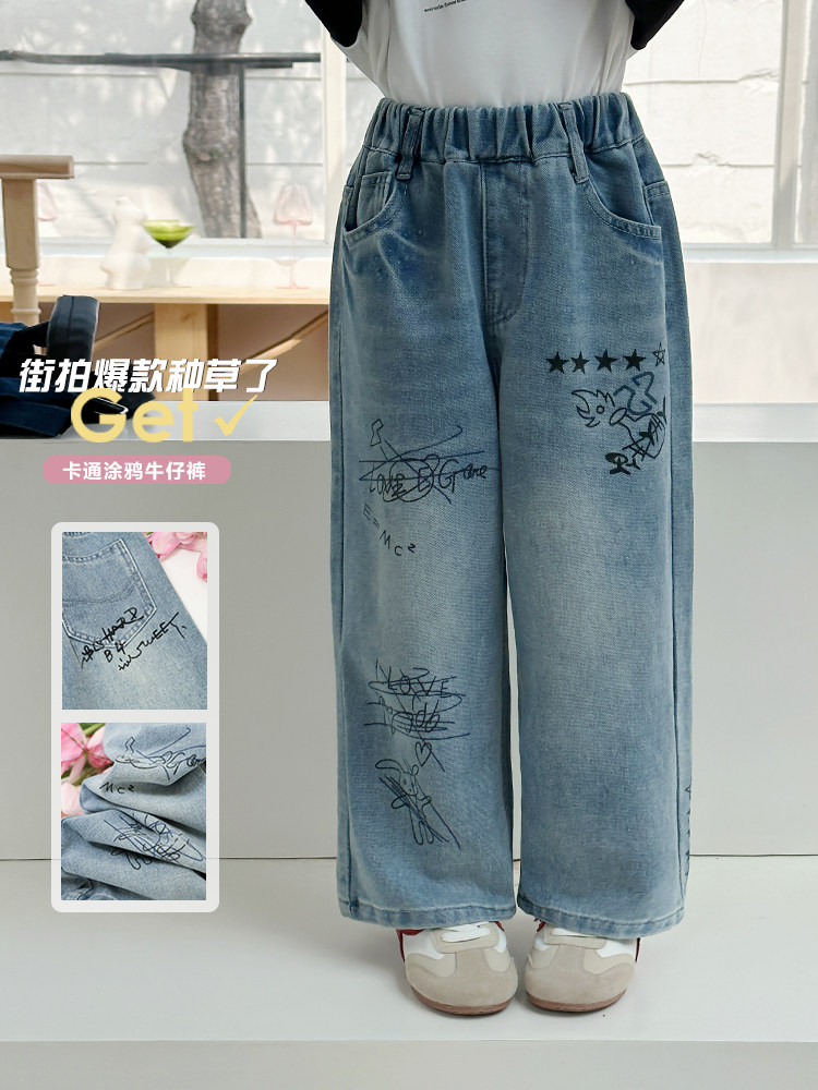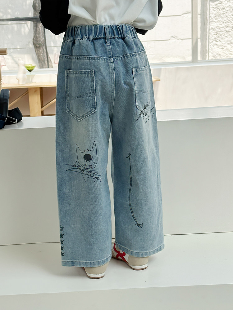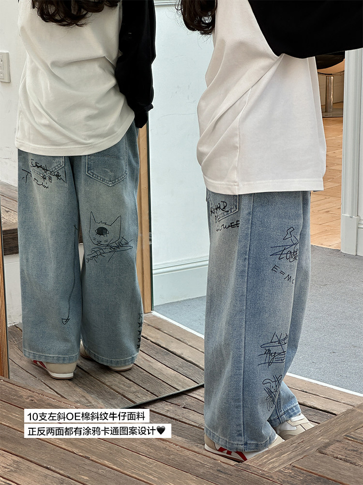 Джинсы, летняя детская летняя одежда, мультяшные штаны, в корейском стиле, высокая талия, свободный прямой крой