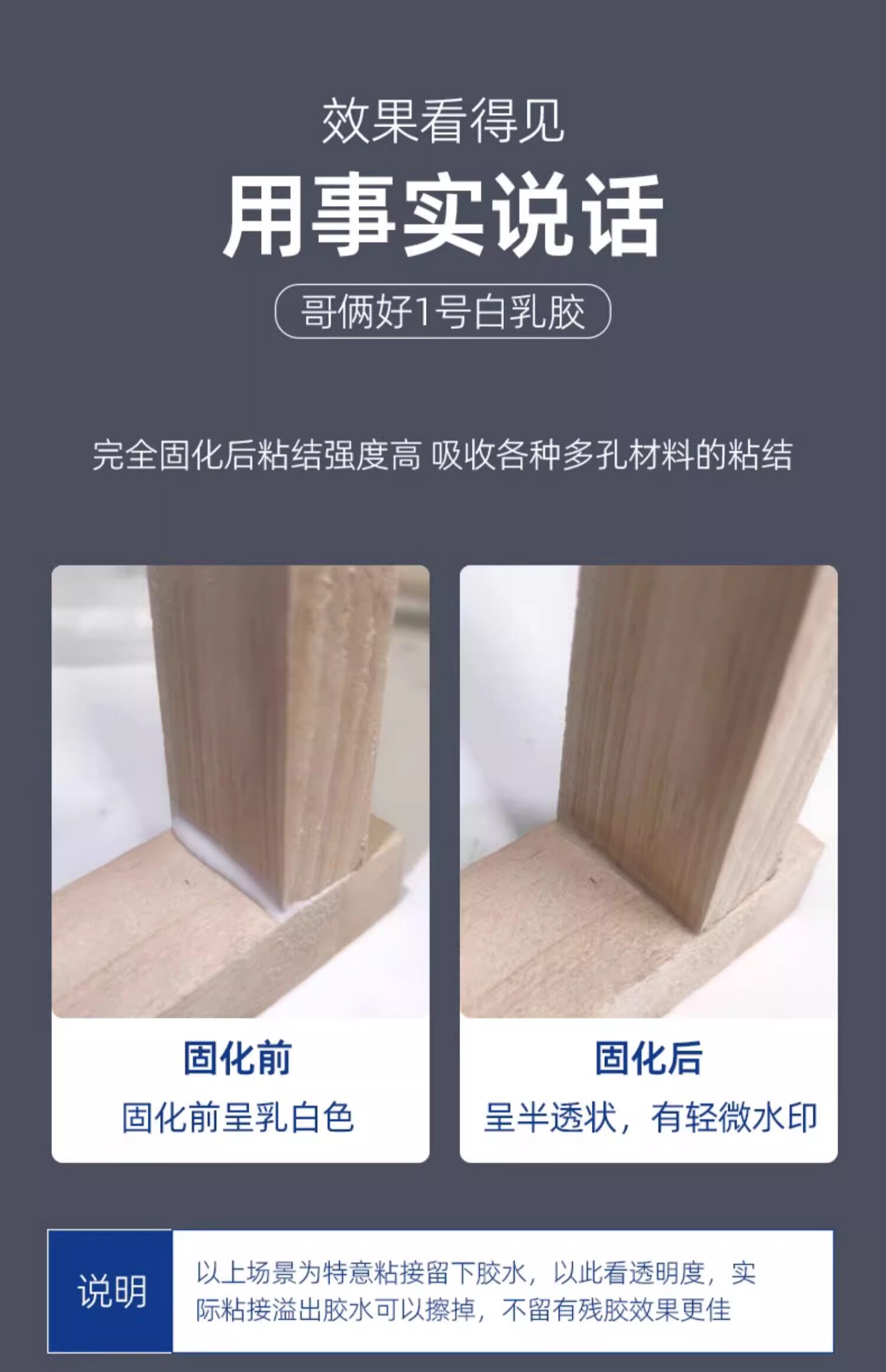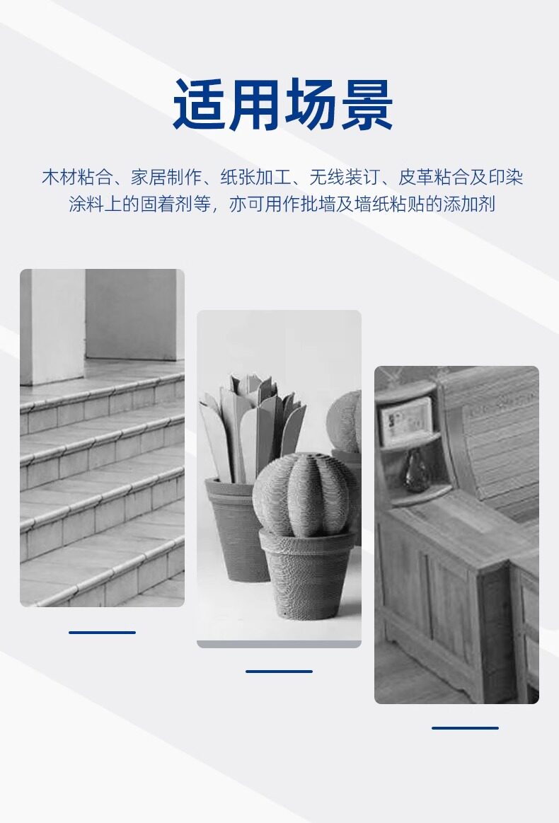 【Область применения】: широко используется при обработке и установке древесных изделий, таких как полы, древесные продукты, карандаши и т. Д., А также подходит для соединения пористых материалов, таких как книги, беспроводная связка и предметы волокна. Он также может быть приготовлен с латексной краской и молочными покрытиями, полимерным цементным раствором, используемым в стенах, полах, украшении здания, украшении искусства и т. Д.