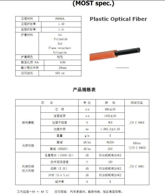 соответствовать“Пластиковое волокно для связи”(YD/T 1447-2006)Стандарт национальной индустрии коммуникации