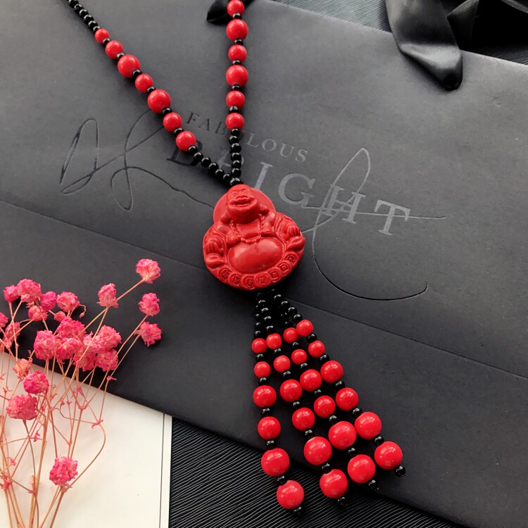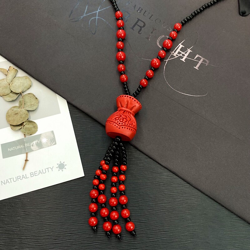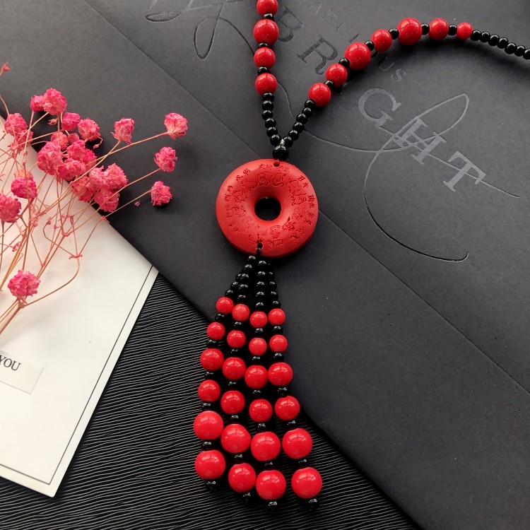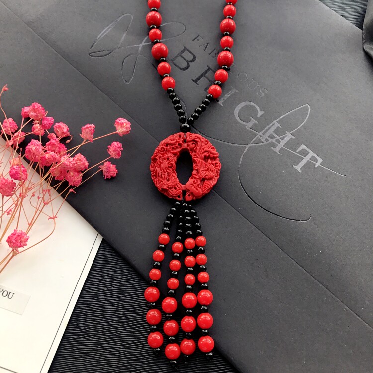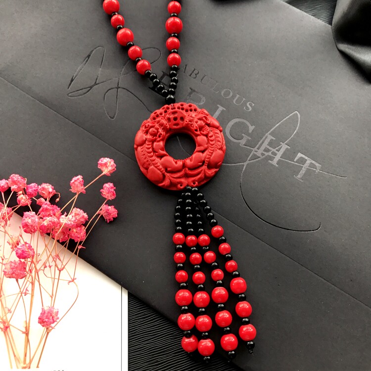 Описание материала: Кулон-ожерелье обработан из киновари, бусины и кисточки цепочки выполнены из акрила.