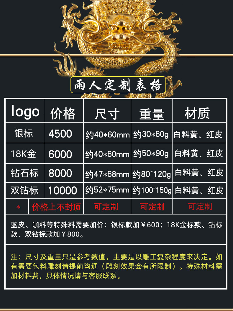 | Цвет: | 【Необходимо настроить】 Около 30-60 г серебристого логотипа, 【Необходимо настроить】 Около 50-90G18K Gold Label, 【Необходимо настроить】 около 80 ~ 120 г алмаза., 【Необходимо настроить】 около 100-150 г двойной бриллиант, [Специальная плата за выбор материала] Добавить 800 юаней (один и тот же тип можно настроить белый материал) |