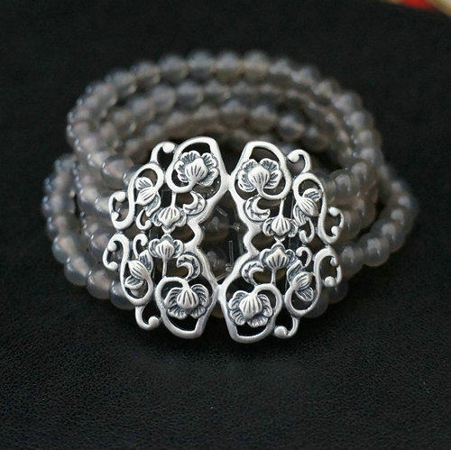 Серебряная бусина имеет ширину 4 см и высоту 3,5 см, а бусины (серый агат и халцедон) — около 0,6 см в диаметре.