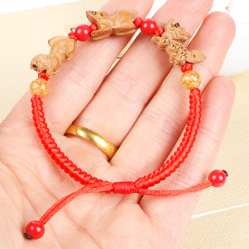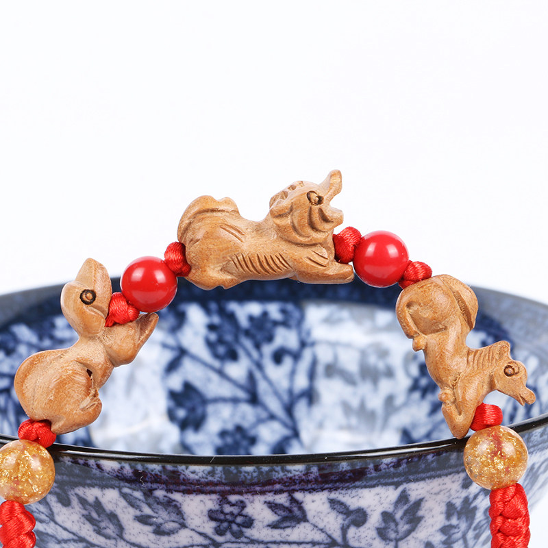 Персиковая древесина 12 зодиака крыса, дракон для кролика тигра, змея, обезьяна, коза, петух -свиньи три -в группе, нынешняя красная веревка, открытый браслет