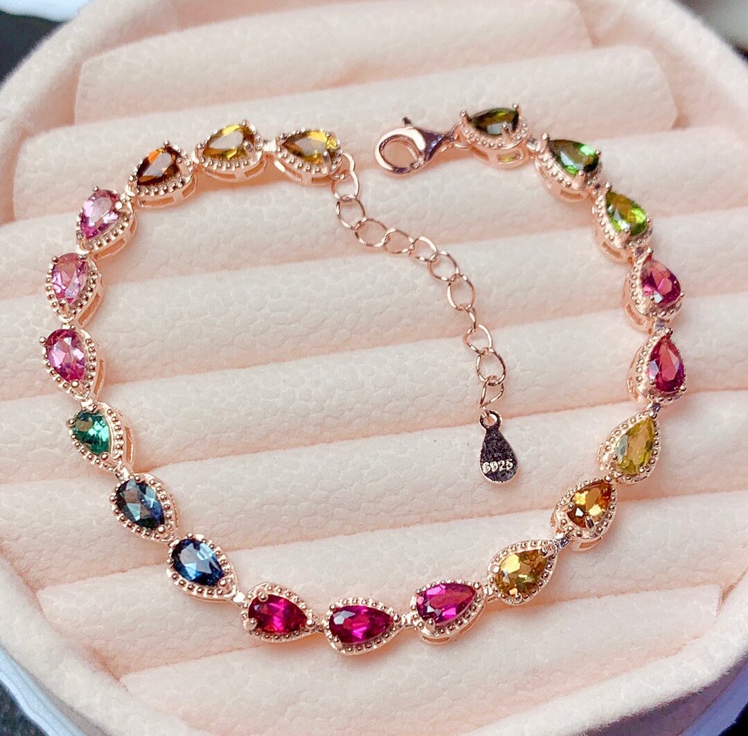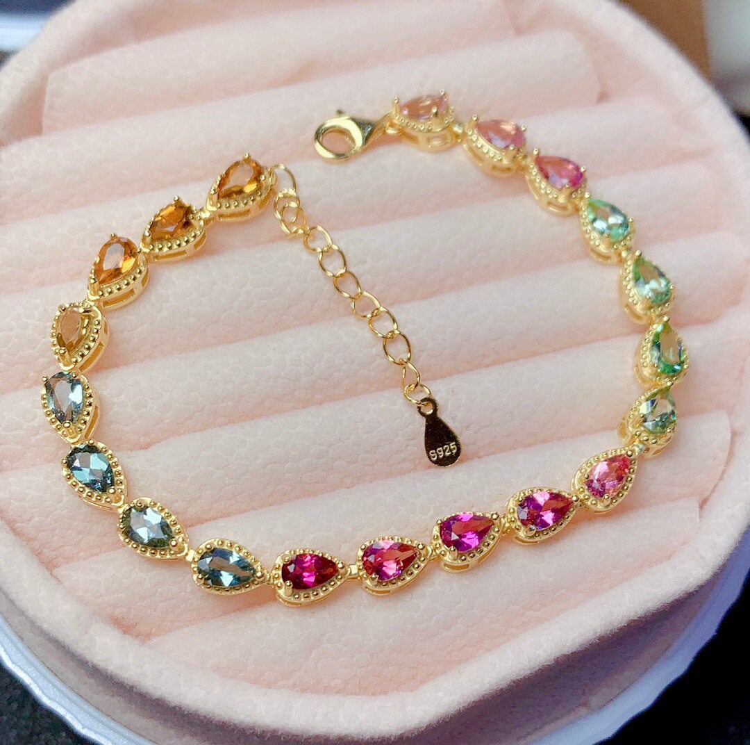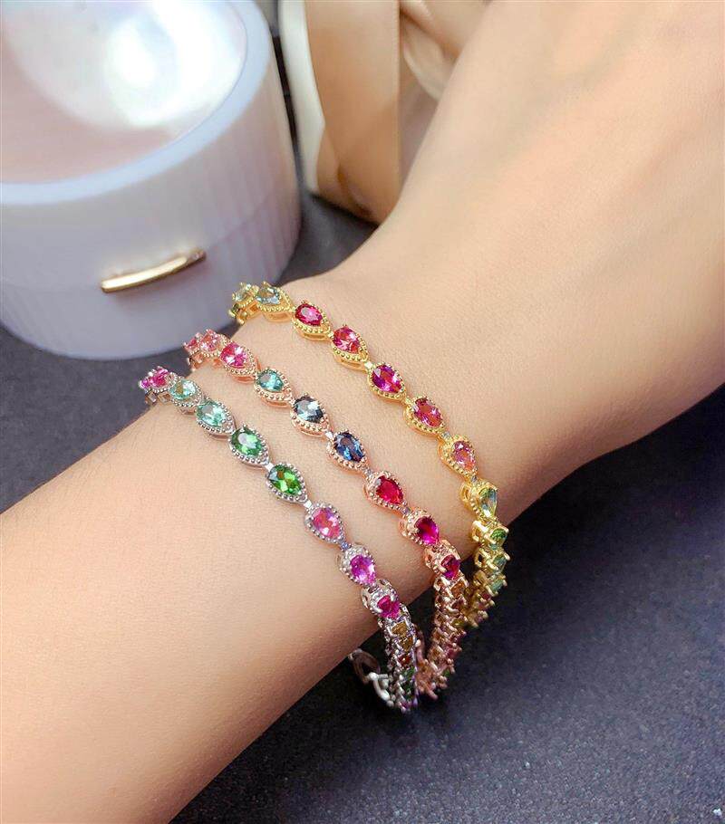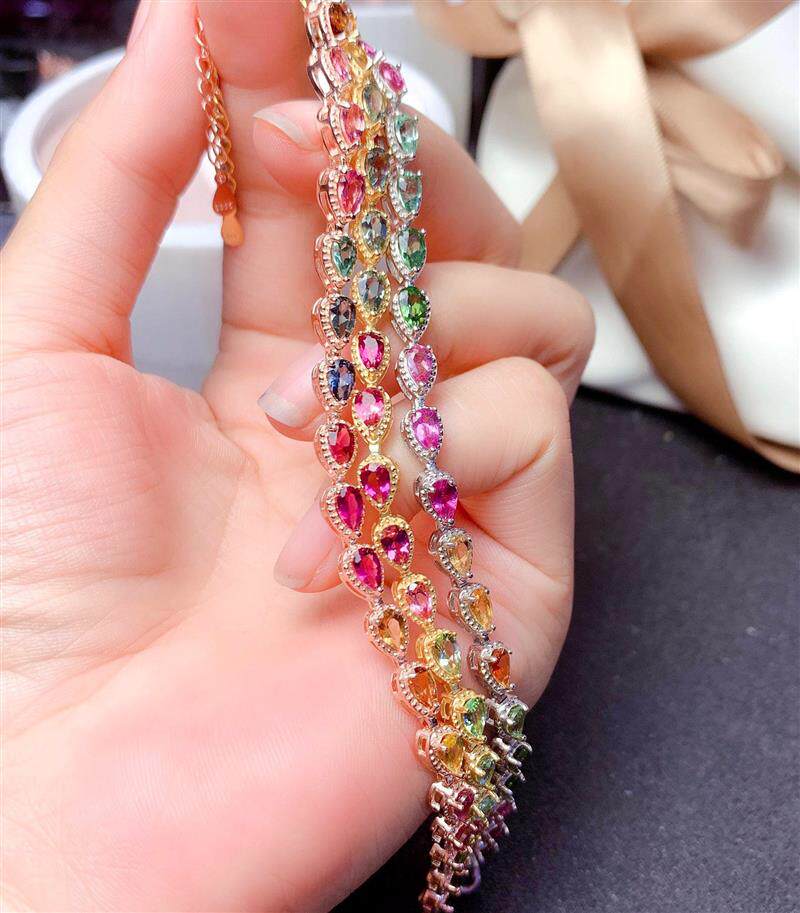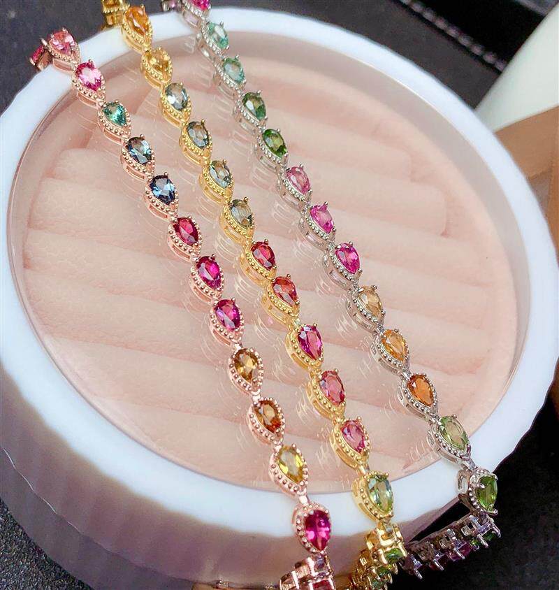 Радужный натуральный турмалиновый модный браслет, серебро 925 пробы, золото 750 пробы