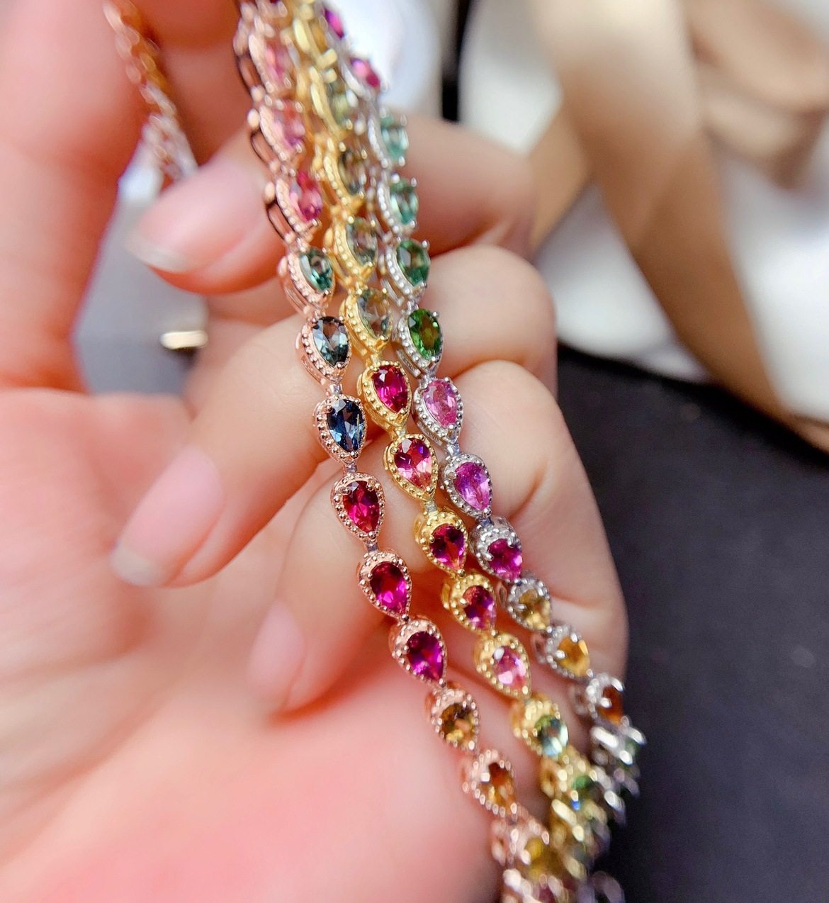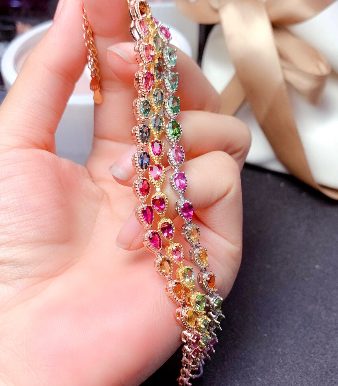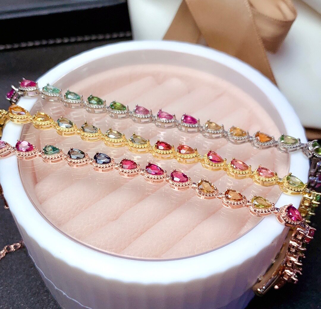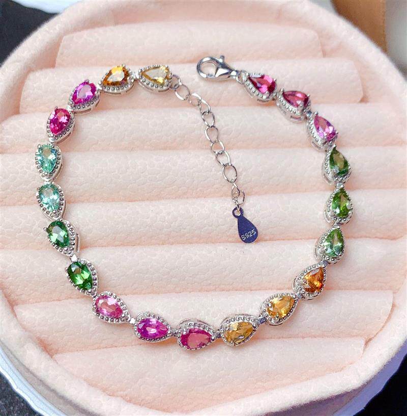 Радужный натуральный турмалиновый модный браслет, серебро 925 пробы, золото 750 пробы