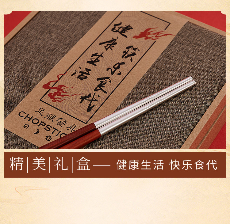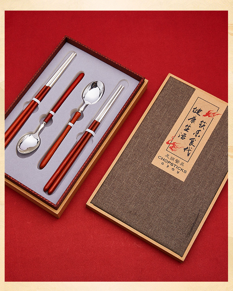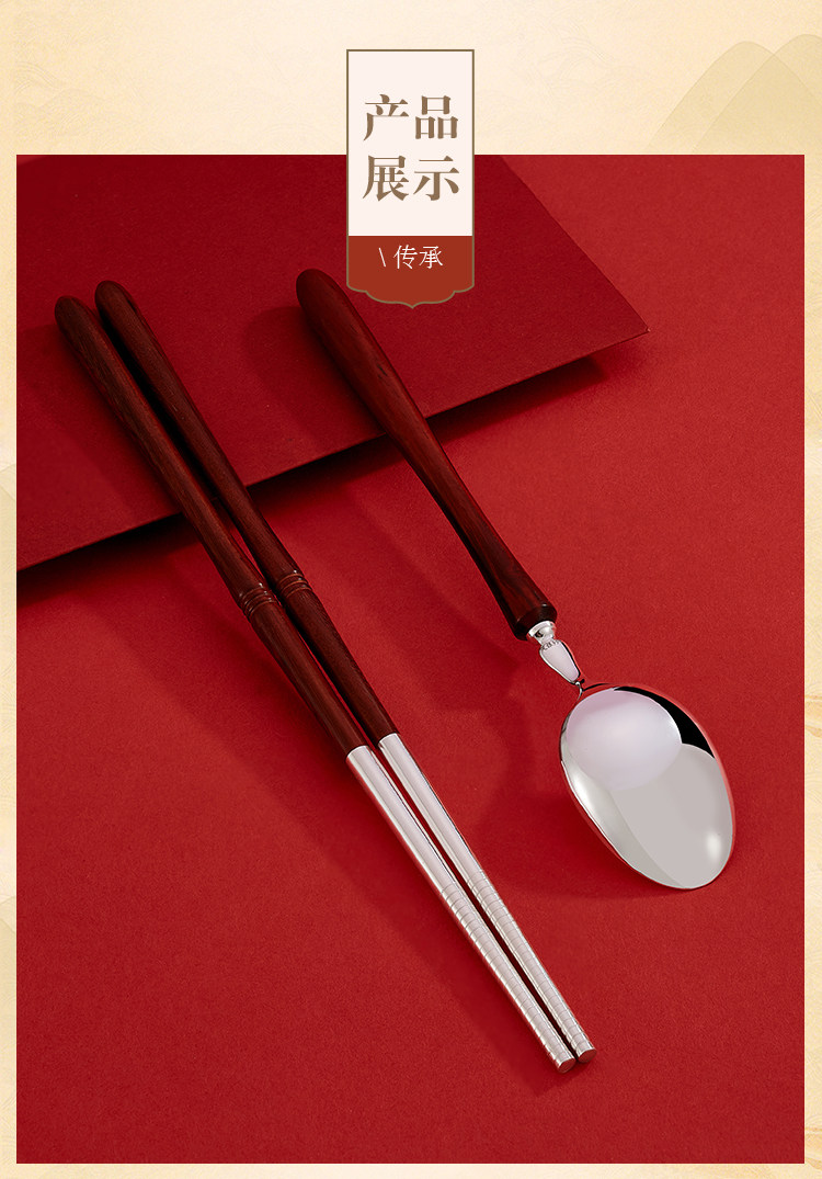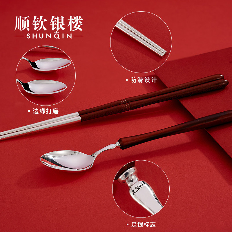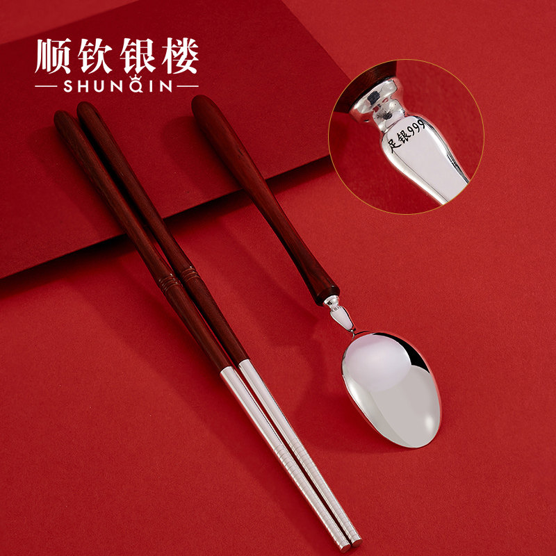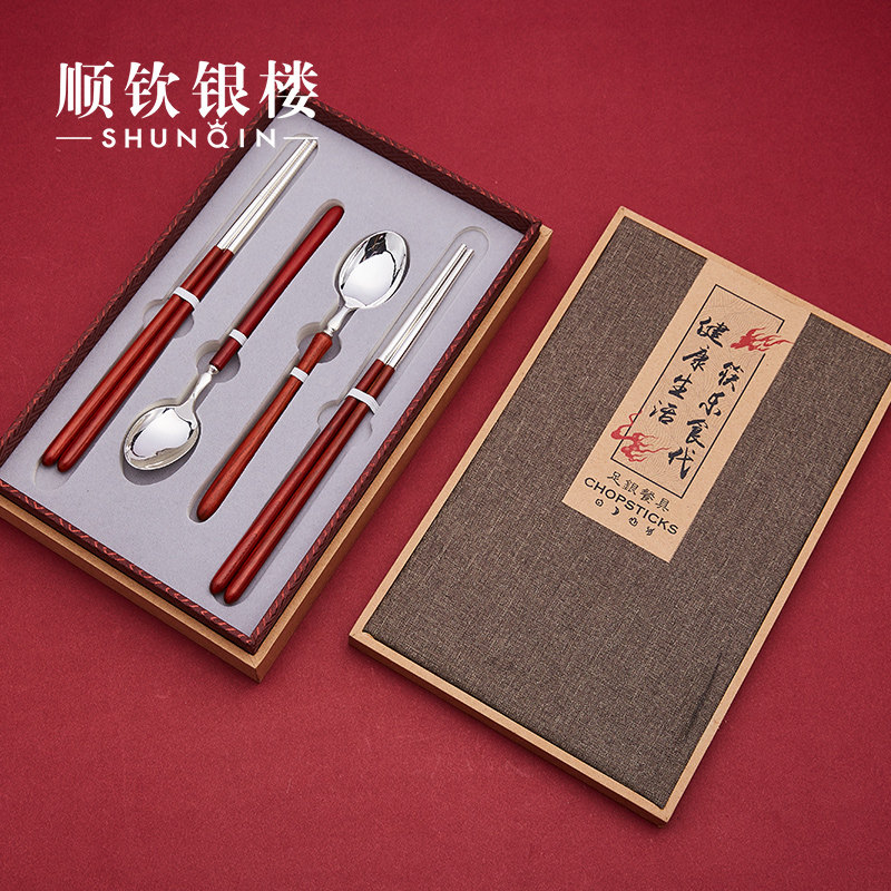 顺钦银楼 Серебряный браслет, палочки для еды, вилка, ложка из сандалового дерева, посуда, комплект, серебро 925 пробы