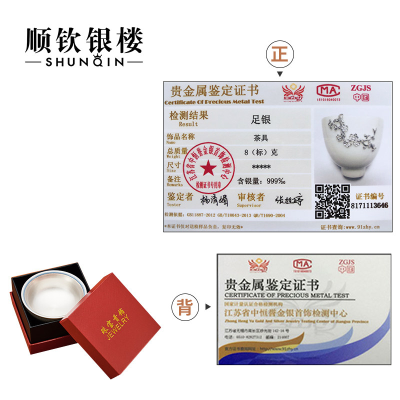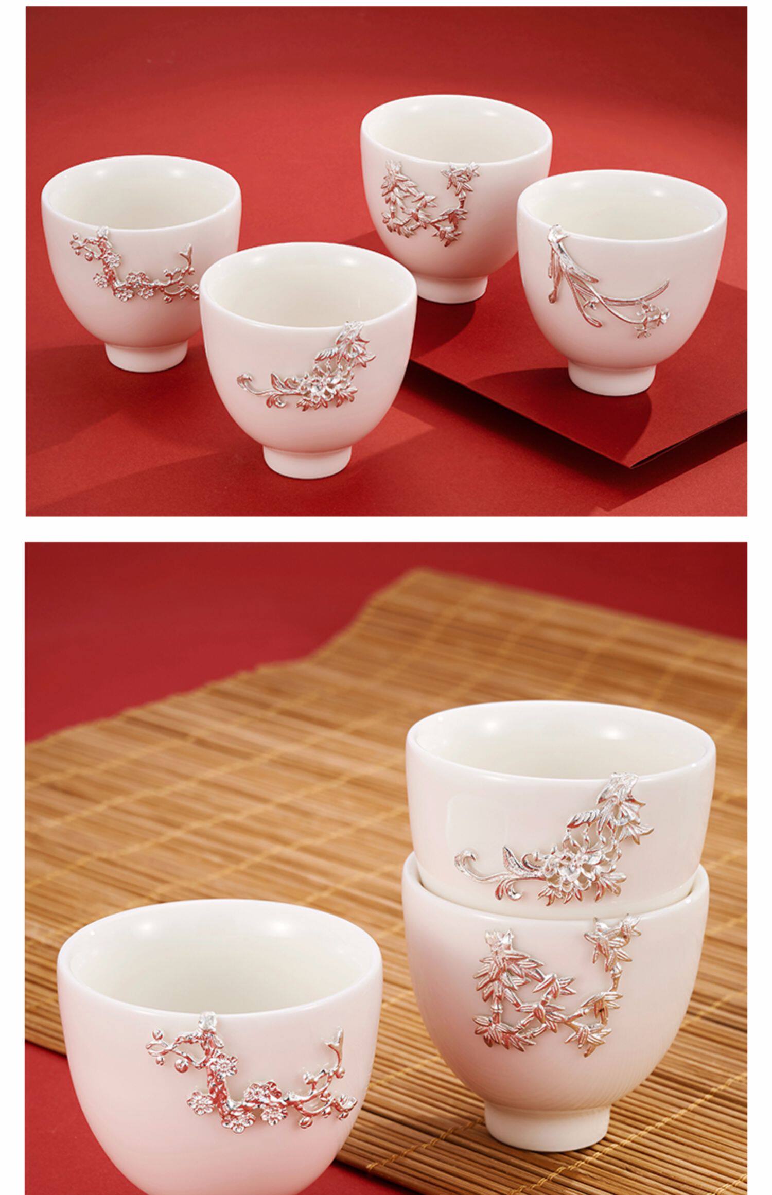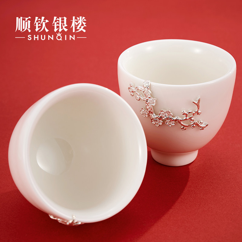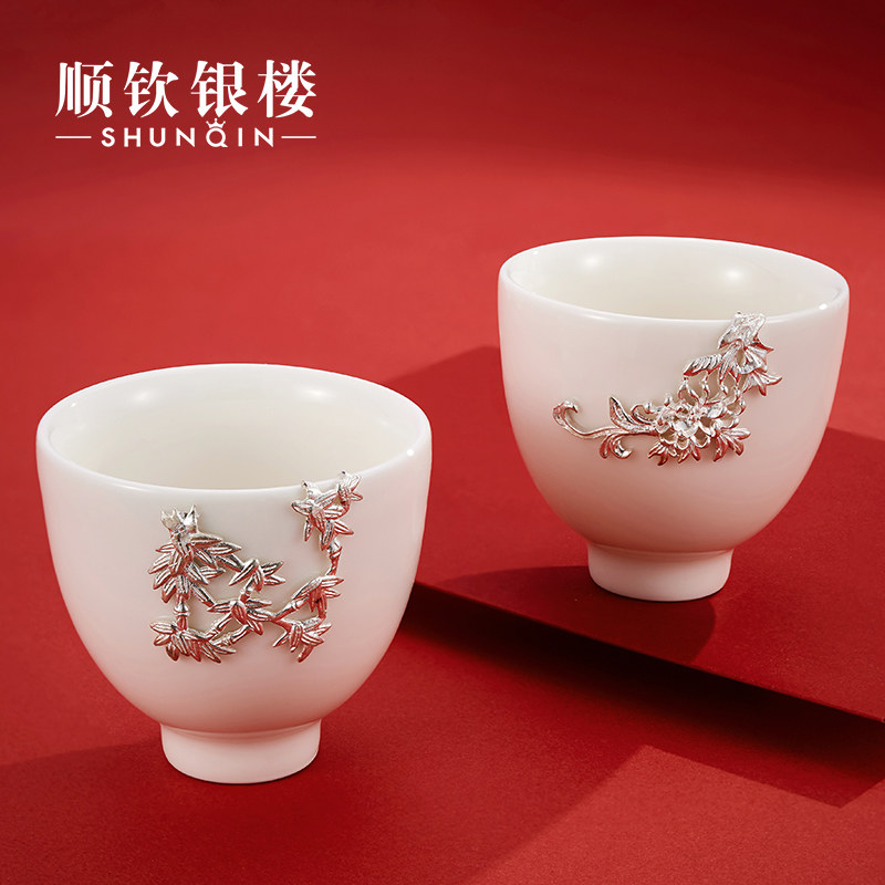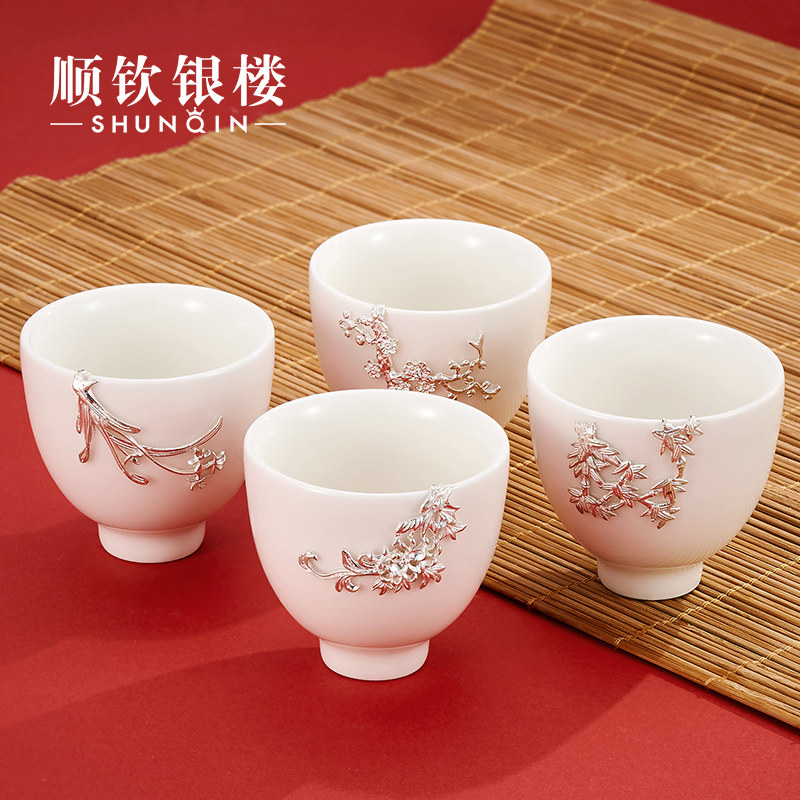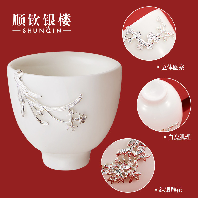 顺钦银楼 Серебряный браслет, инкрустация камня из белого нефрита, фарфоровая высококлассная чайная чашка, подарок на день рождения