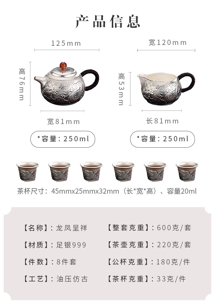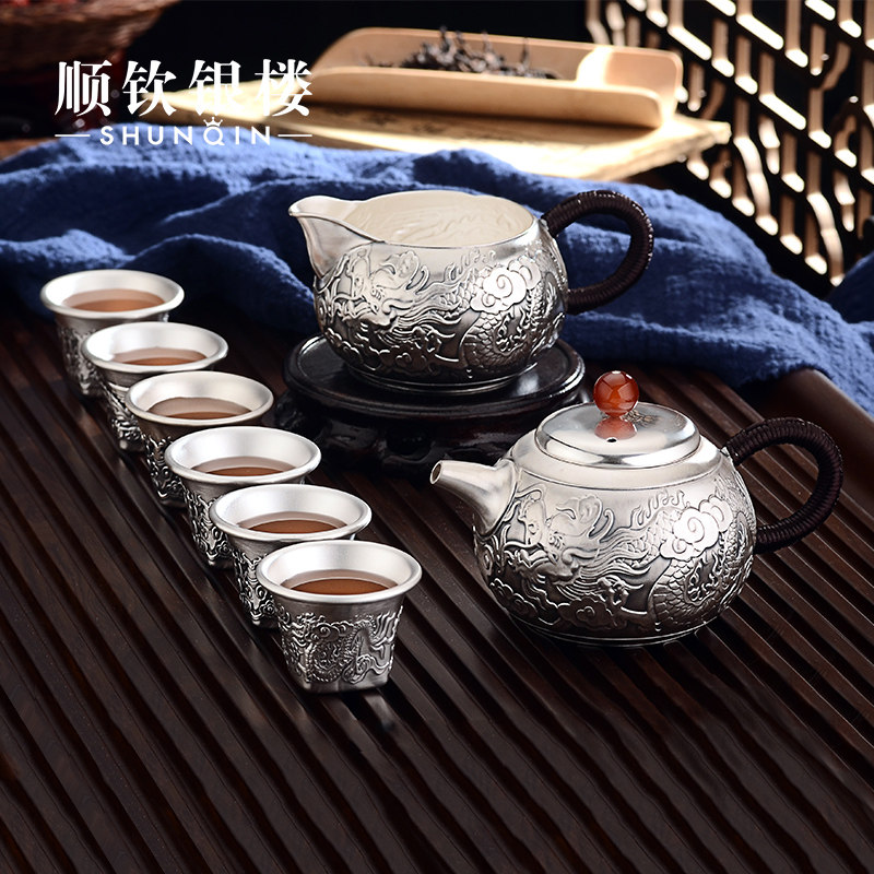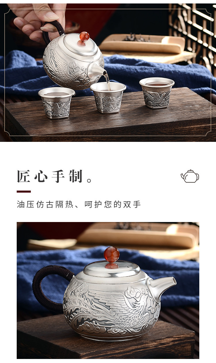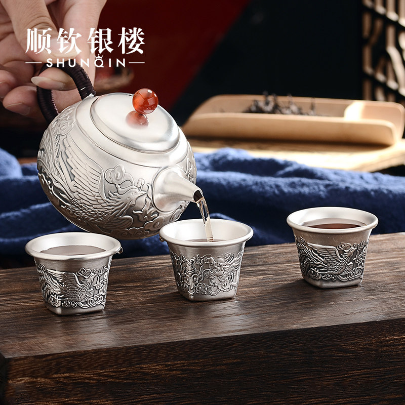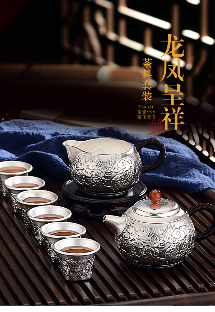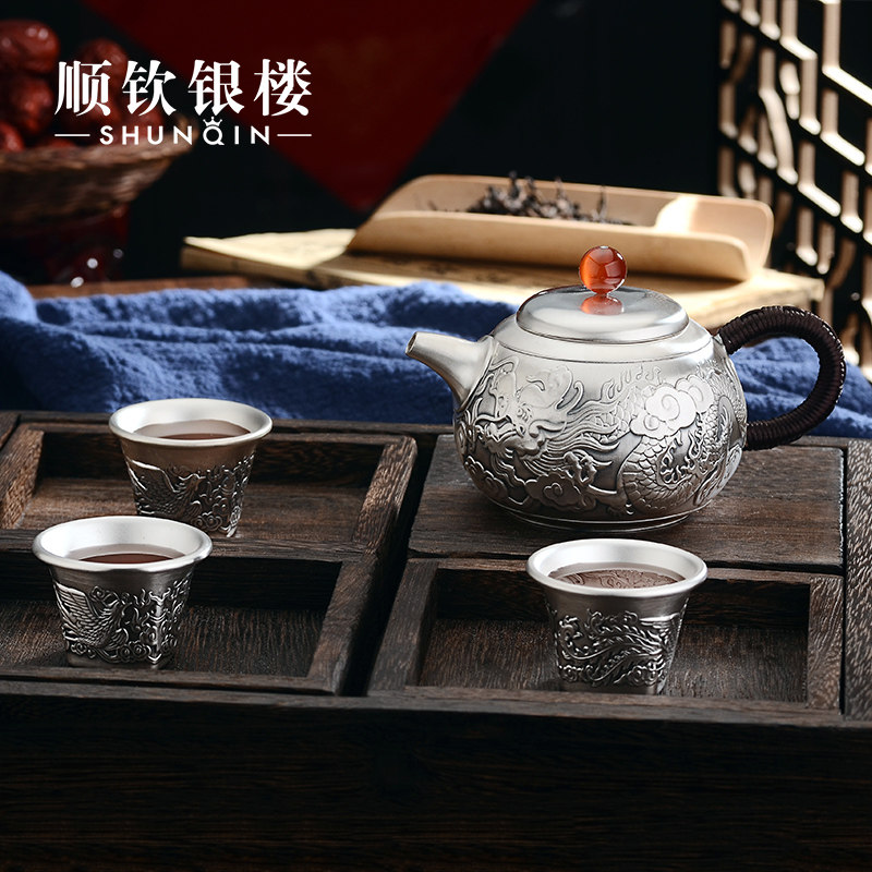 Чайный сервиз, комплект, заварочный чайник, серебро 999 пробы, дракон и феникс, подарок на день рождения