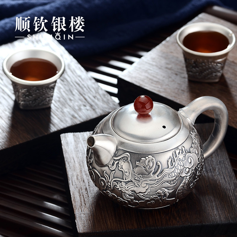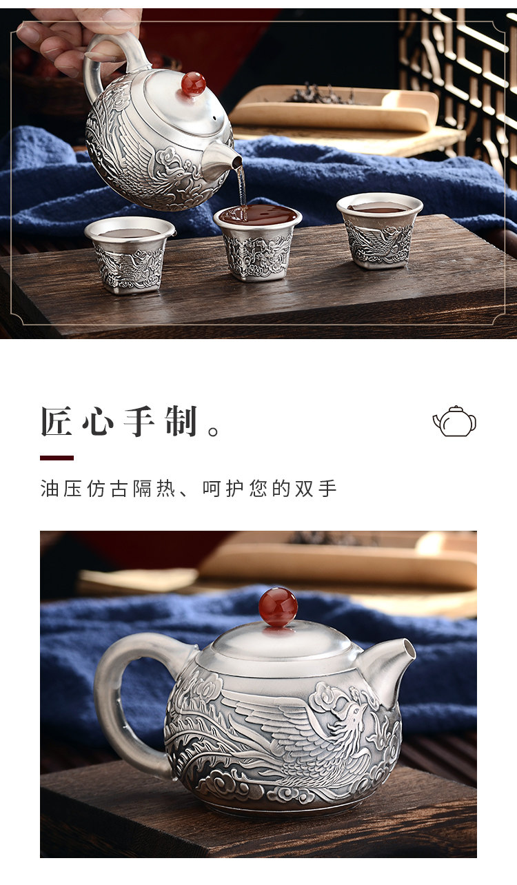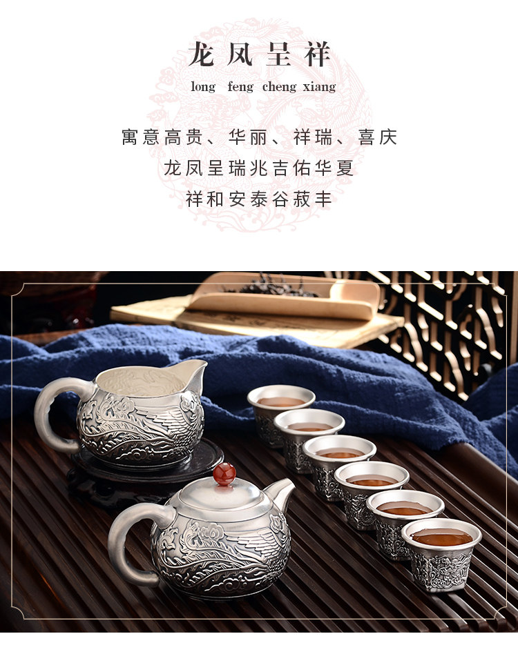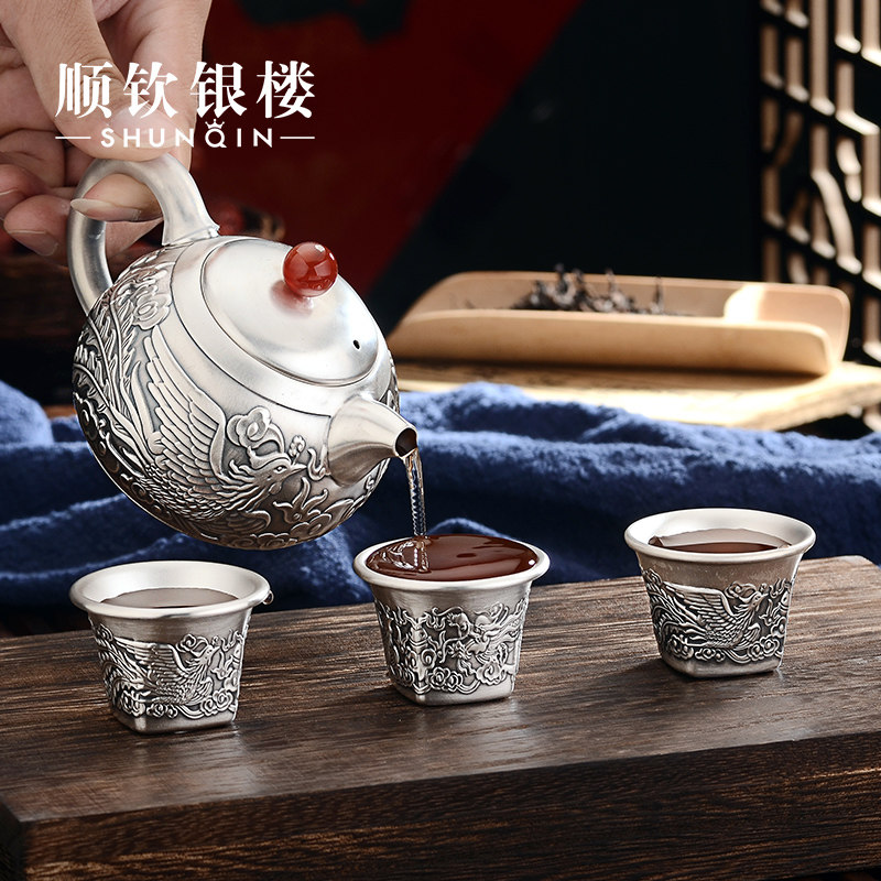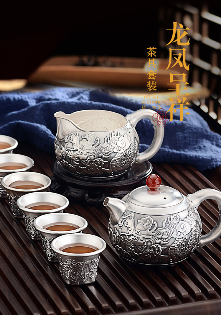 Чайный сервиз, высококлассный комплект, серебро 999 пробы, дракон и феникс, китайский стиль