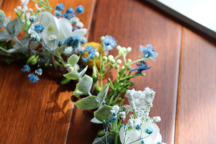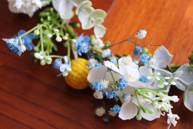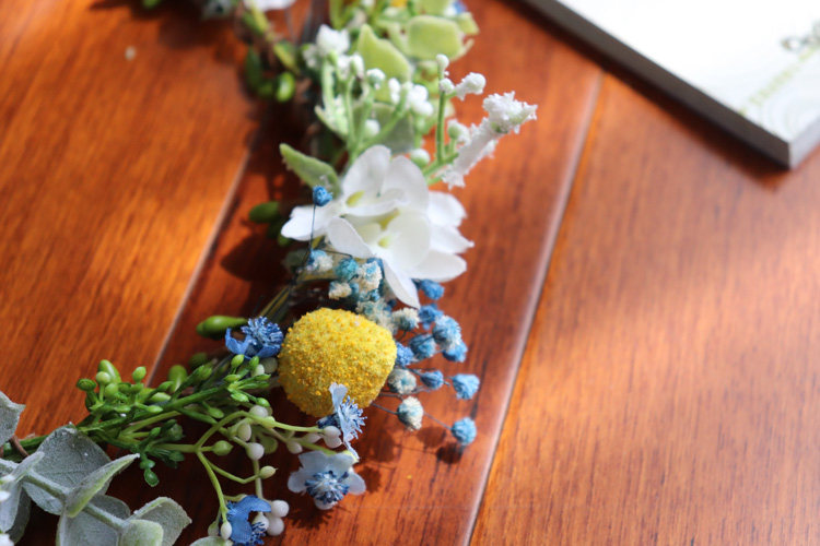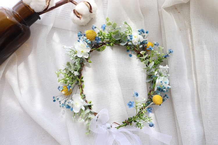 (Синий, белый и розовый гипсофилы/золотые шарики — это засушенные цветы). Остальные материалы — шелковая ткань/пластик.