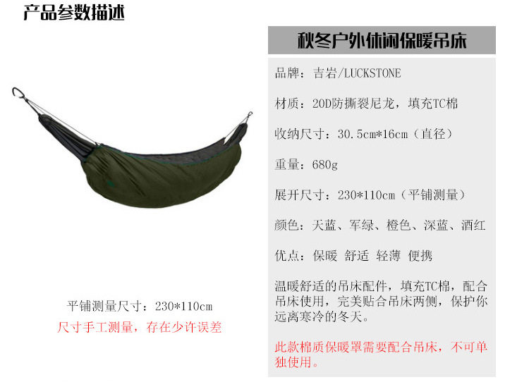 Теплые и удобные аксессуары подвески, заполните хлопок TC, используйте его подвеской, установите по бокам гамака, чтобы защитить вас от холодной зимы.Быстрое и простые методы использования, оба конца могут быть отрегулированы по длине, подходящие для различных типов подвески, тесно сопоставленных.