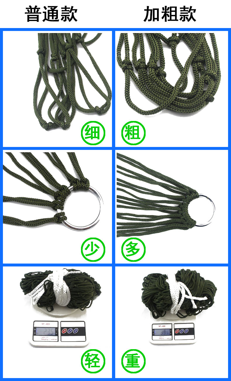 [普通网状吊床没有收纳袋,配有绑绳。加粗款网状吊床配有绑绳和收纳袋。豪华款加粗网状吊床配绑绳、收纳袋和专业绑带。]
