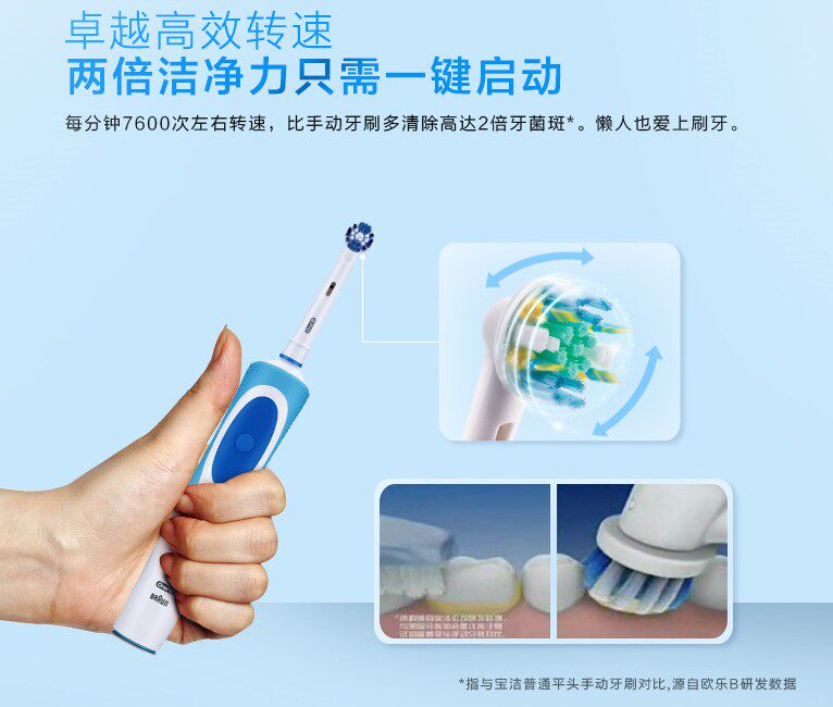 Электрические зубные щетки используют технологию вибрации.Ole B, первая технология вибрации в 1991 году, опубликовала более 60 клинических исследований, подтверждая превосходную производительность этой технологии.Теперь, независимое исследование вехи подтверждает точку зрения точки зрения точки зрения OLE B-Vibration Rotation, лучше, чем другие технологии электрических зубных щетков.Это движение чистки полностью отличается от обычных ручных зубных щетков, потому что зубные щетки чистят свои зубы, вам нужно только направлять головку щетки ко всем частям рта.
