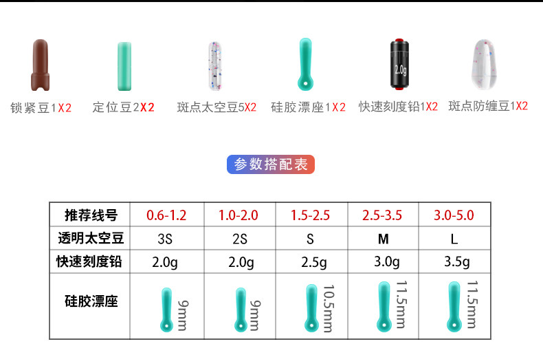 | Цвет: | 3S (2 набора, применимые к строке 0,6-1,2), 2s (2 набора, применимо к строке 1.0-2.0), S (2 набора, применимые к строке 1.5-2.5), M (2 комплекта, применимо к строке 2.5-3.5), L (2 комплекта, применимо к строке 3.0-5.0) |