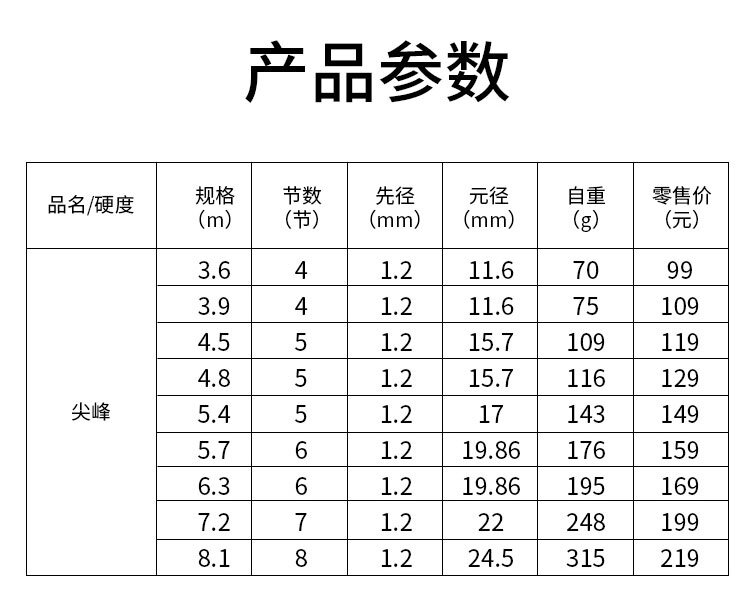 | Цвет: | Пик удочки 3,6 метра., Пик удочки 3,9 метра., Пик удочки 4,5 метра., Пик удочки 4,8 метра., Пик удочки 5,4 метра., Пик удочки 5,7 метра., Пик удочки 6,3 метра., Пик удочки 7,2 метра., Пик удочки 8,1 метра. |