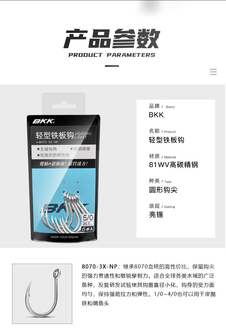 Подлинный BKK Black King Kong Fish Hook 8070-3x-NP Легкая круглая точка рыбалка с рыбалкой железной крюк
