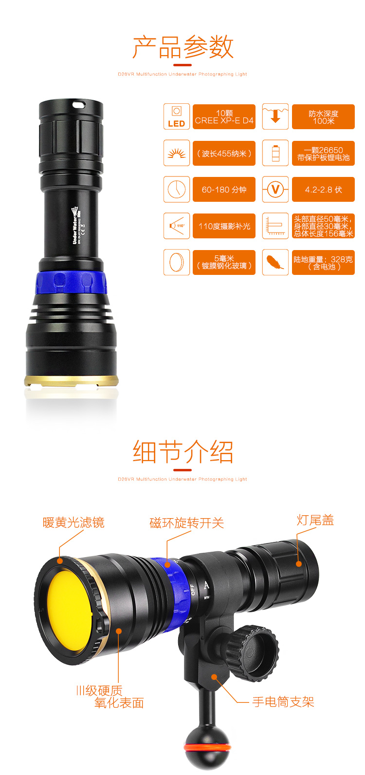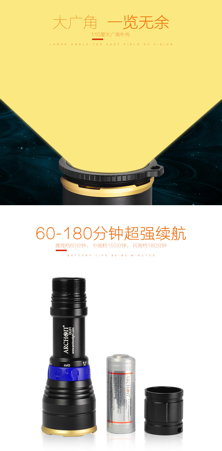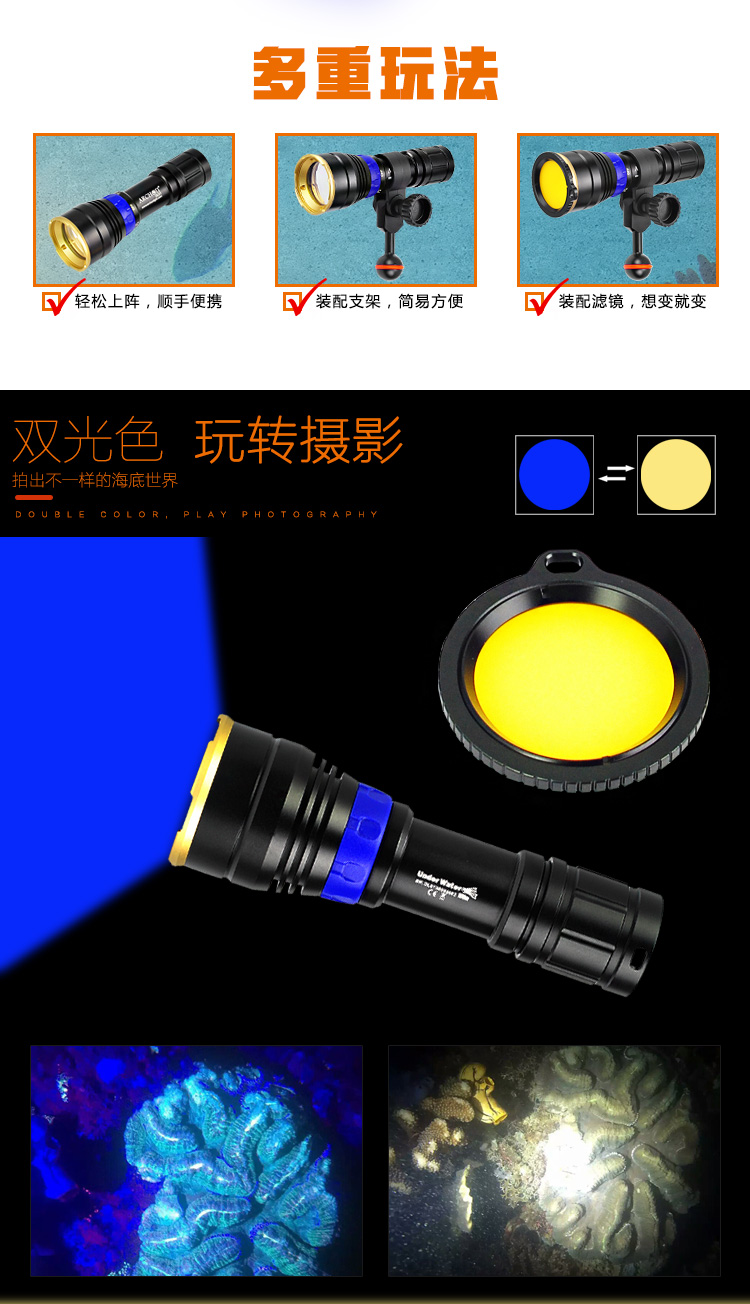 ARCHON(AITONG) DL01 Diving Light - это портативный дайвинг -фотография заполняет свет.Этот свет может работать с одной рукой,Это легко принести и оснащено профессиональной фотографией, которая может отражать яркую флуоресценту белка и минералов.Более того, если вы используете стандартный желтый фильтр в этом свете, дайверы могут наблюдать за высоко насыщенными психоделическими цветами и узорами и воспринимать эффект фотографии, который вы хотите.Профессионализм и разнообразие лампы делают его идеальным оборудованием для технического дайвинга и досуга.