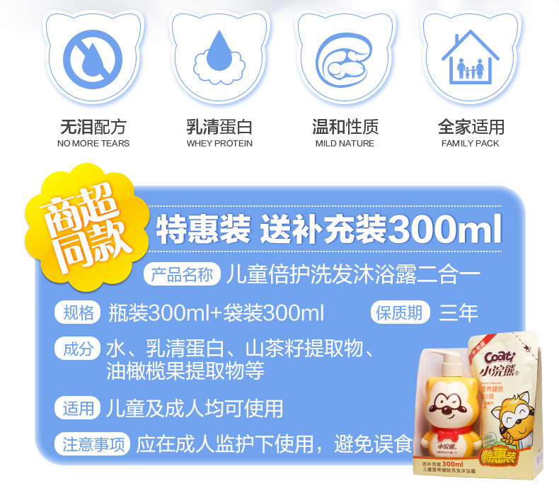 Coati/小浣熊 Средство детской гигиены, шампунь, гель для душа, 300 мл, 300 мл, 2 в 1