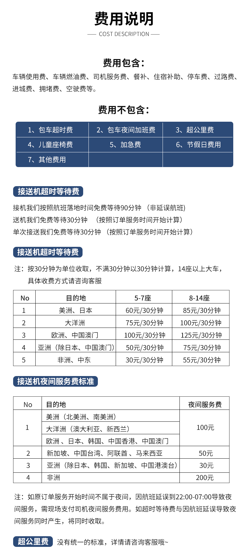 5. Если вы пользуетесь автомобилем с 22:00 по местному времени до 07:00 следующего дня, водитель будет работать сверхурочно и взимается плата за ночное обслуживание.По умолчанию в стоимость обслуживания клиентов не включена плата за ночное обслуживание.