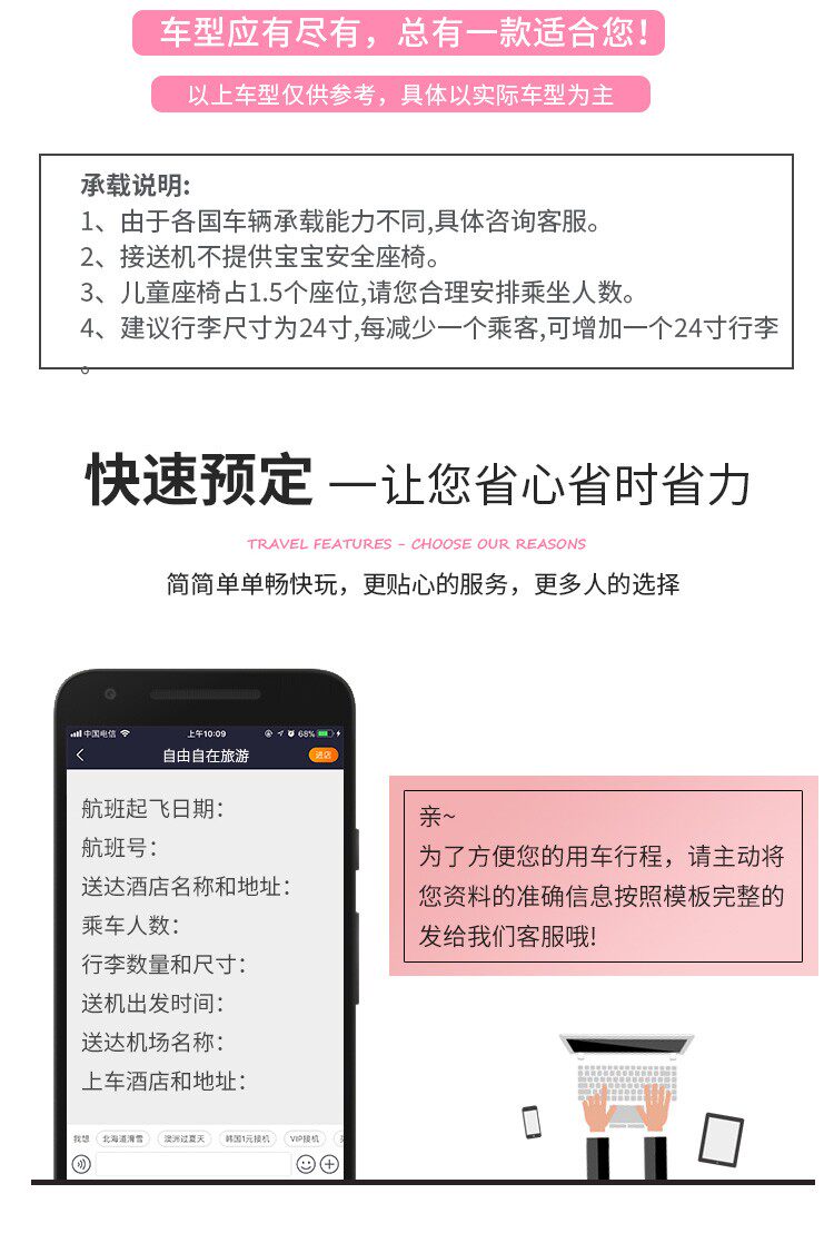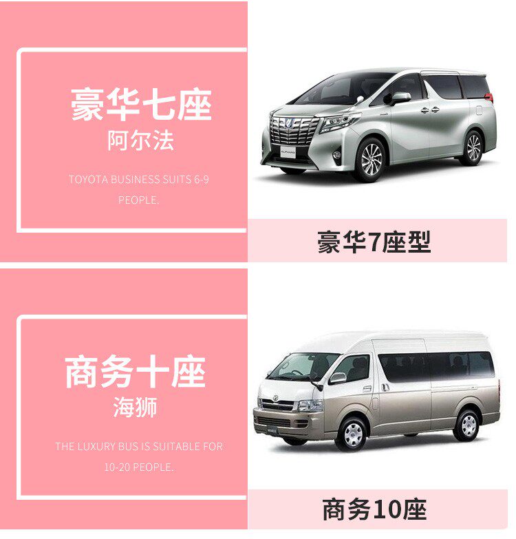 | Модельный уровень: | Комфортный 5-местный автомобиль (Crown Prius и т.п.), Роскошный 7-местный автомобиль (Alfa Wilfa или аналогичный), Бизнес 10-местный (Toyota Hiace), CMB 16-20 мест (каста), Автобус более 36 мест (Coaster) |