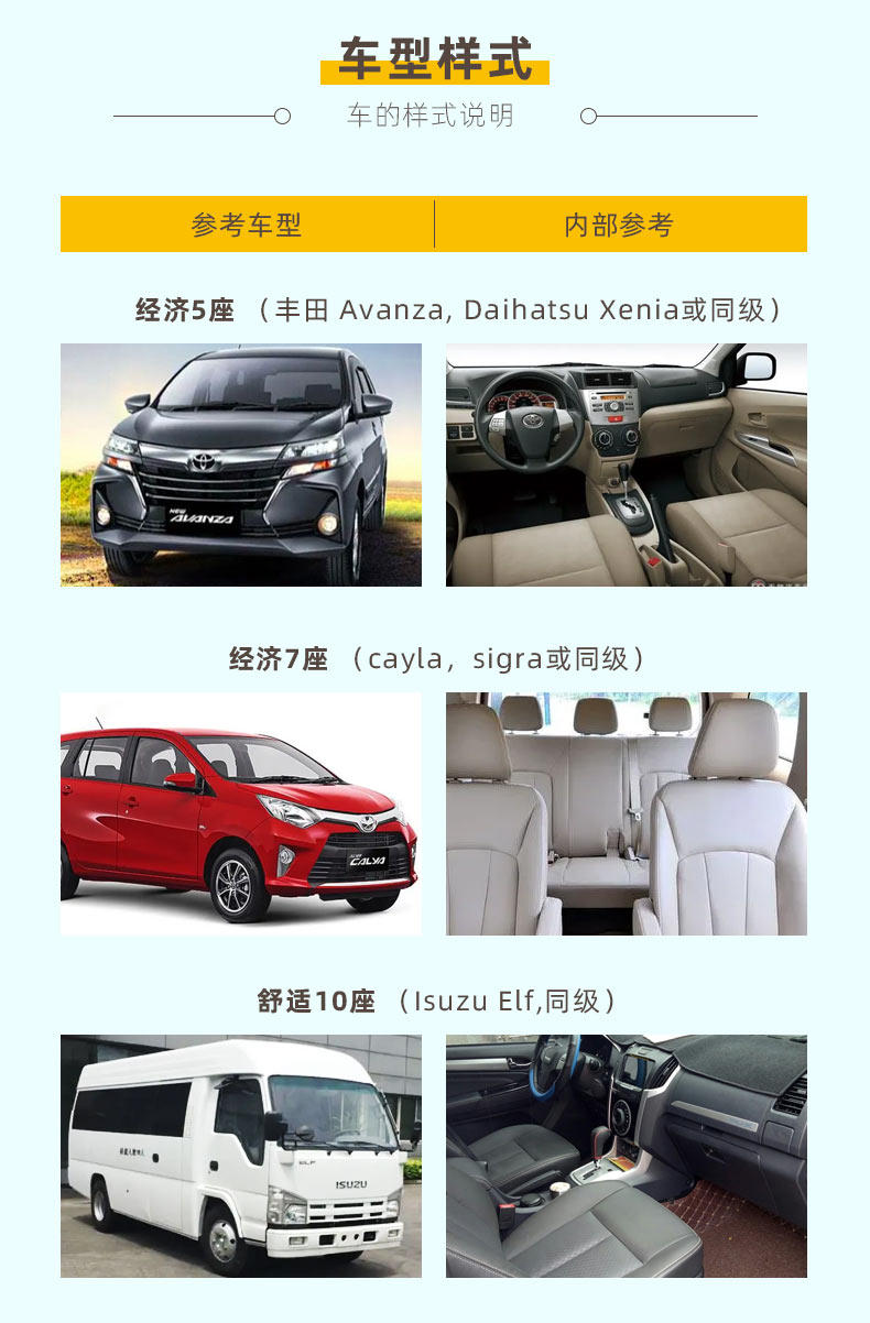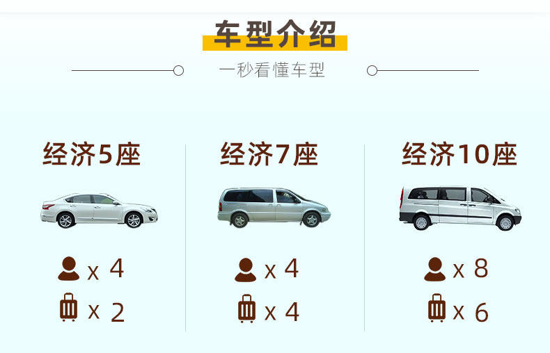 | Модельный уровень: | Эконом-5-местный (≤ 3 человека и 2 багажа), Эконом 7 мест (≤4 человека и 4 багажа), Микроавтобус 10-15 мест (≤10 человек и 10 багажа), 10-местный микроавтобус (≤8 человек и 6 багажа) |