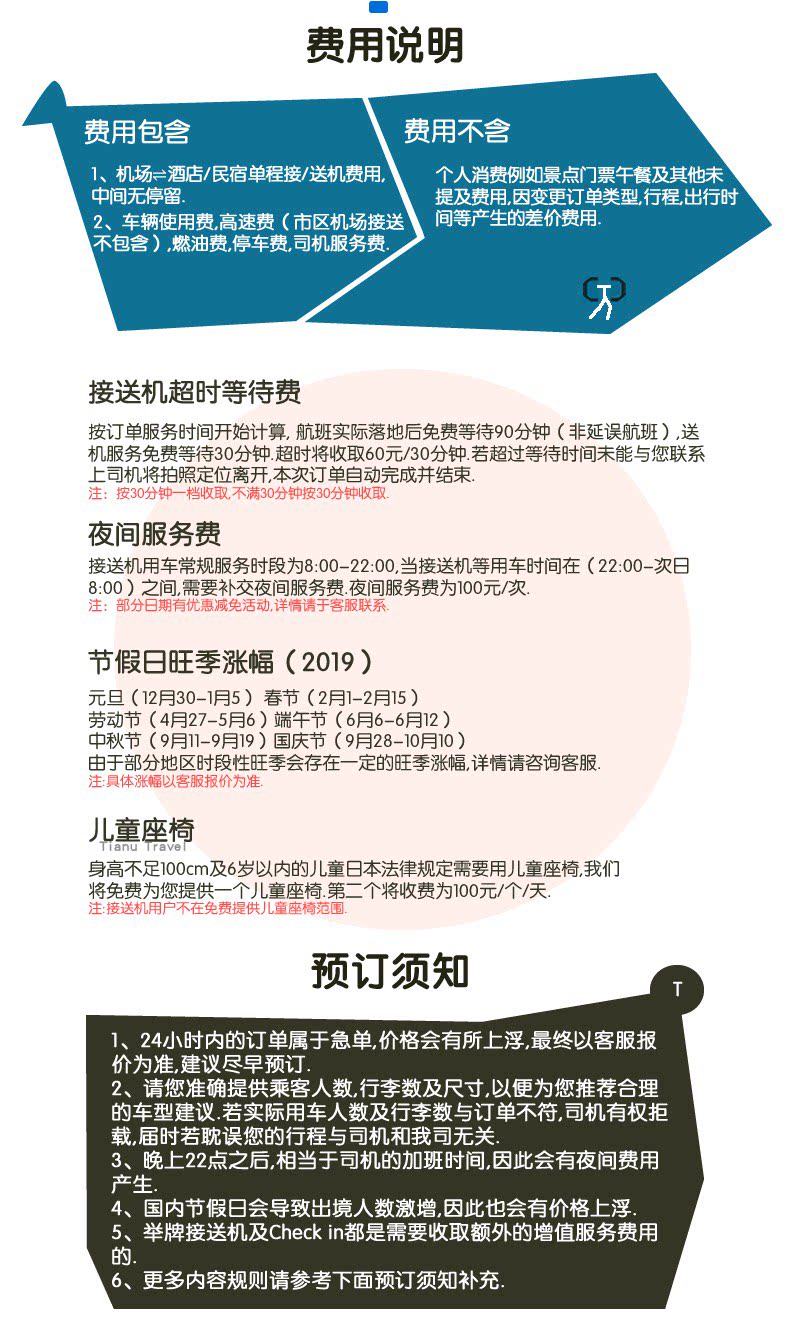 14. Встреча в аэропорту: если рейс задерживается, вам придется бесплатно ждать 2 часа. После приземления самолета вам придется подождать 90 минут в соответствии с фактическим временем посадки.Услуга встречи в аэропорту: в соответствии с первоначально согласованным временем водитель будет бесплатно ждать 30 минут по прибытии в согласованное место.Если бесплатное время ожидания трансфера из аэропорта превышает 10 минут↑30 минут↓Заплатите 2500 иен или эквивалент юаней по обменному курсу в реальном времени за 30 минут непосредственно водителю и так далее.