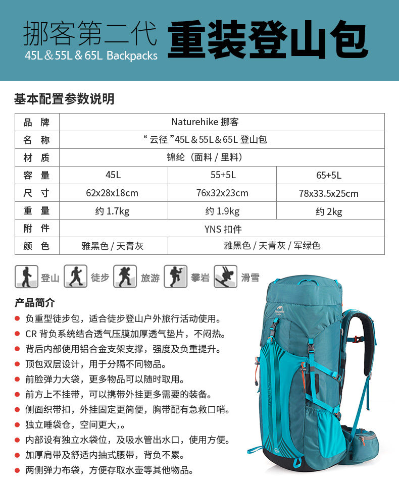 Naturehike Легкий рюкзак подходит для пеших прогулок для кемпинга, вместительная и большая сумка через плечо