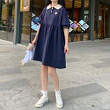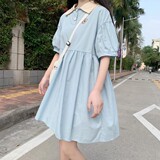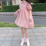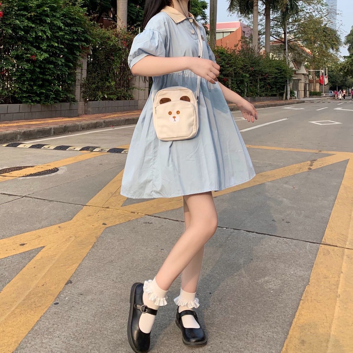 Японское милое летнее платье, юбка, сезон 2021, воротник поло, с вышивкой, с медвежатами, короткий рукав