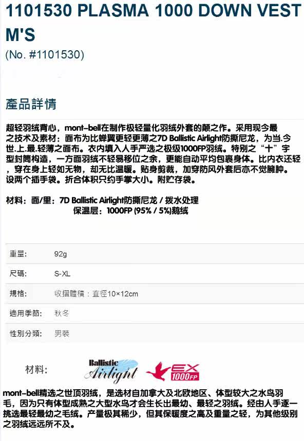 Montbell 1101530 Мужская легкая пиджак жилет Plasma 1000 Puff Down Vest
