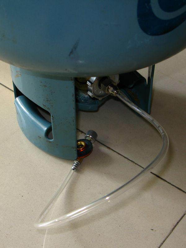 Откройте ручку сжиженного газового цилиндра, затем вы увидите, что сжиженный газ течет в трубе