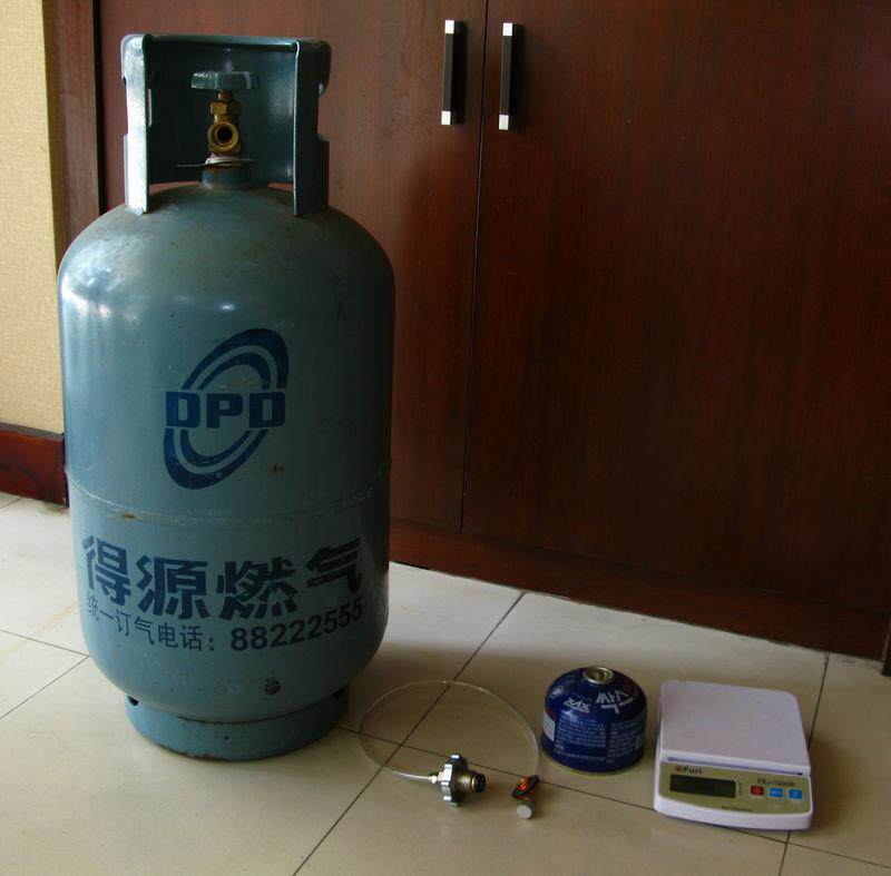 Подготовьте вещи, которые будут использоваться: бутылка сжиженного газа, надувной клапан, пустая плоская банка, электронная масштаба