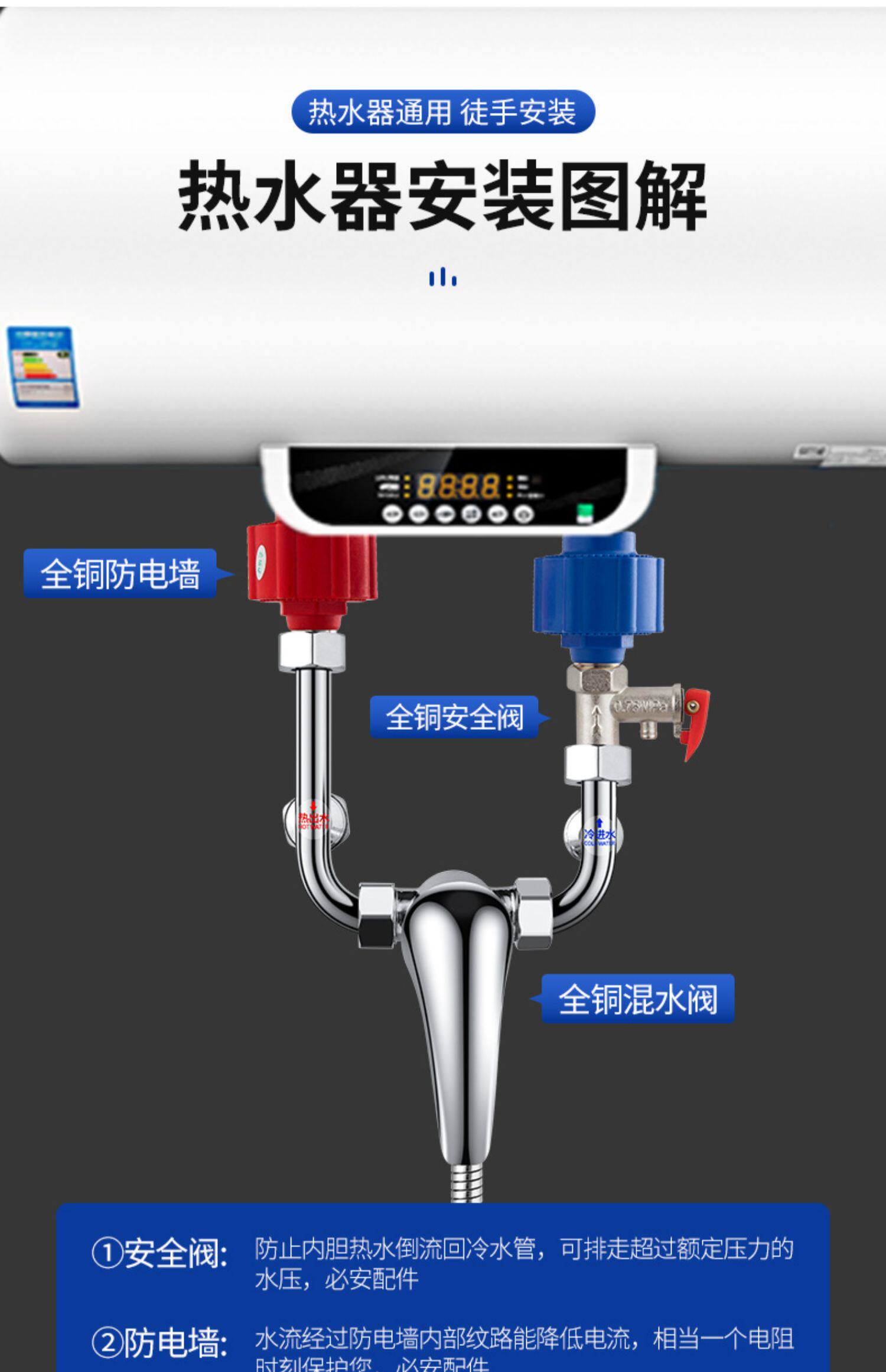 - [Модель толстой обновления] Красная и синяя антиэлектрическая стенка ● 2 установка+предохранительный клапан+смешанный клапан