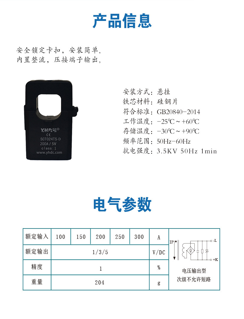Импульсный трансформатор тока YHDC 100A-300A, выход терминала SCT024TS-D