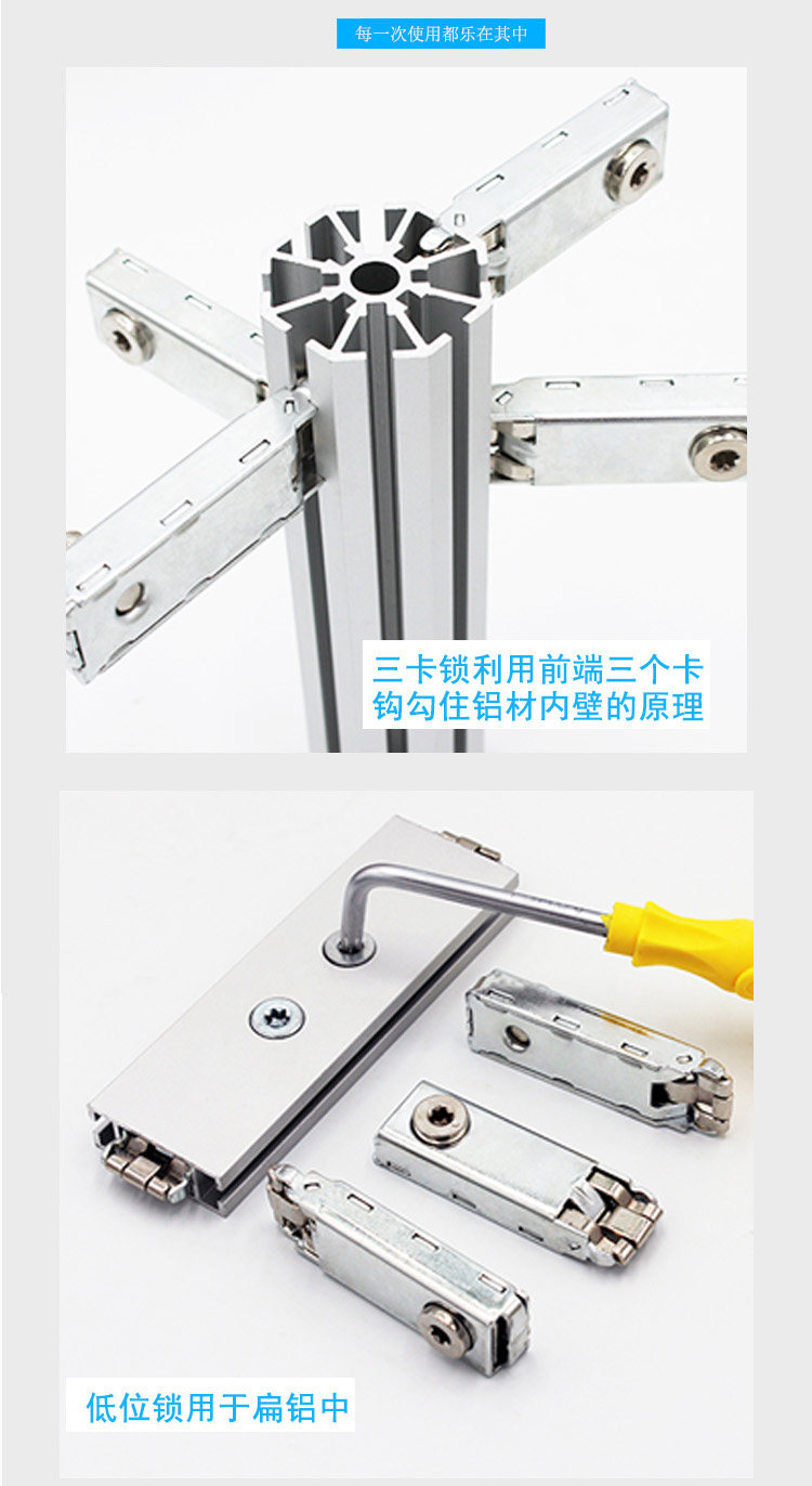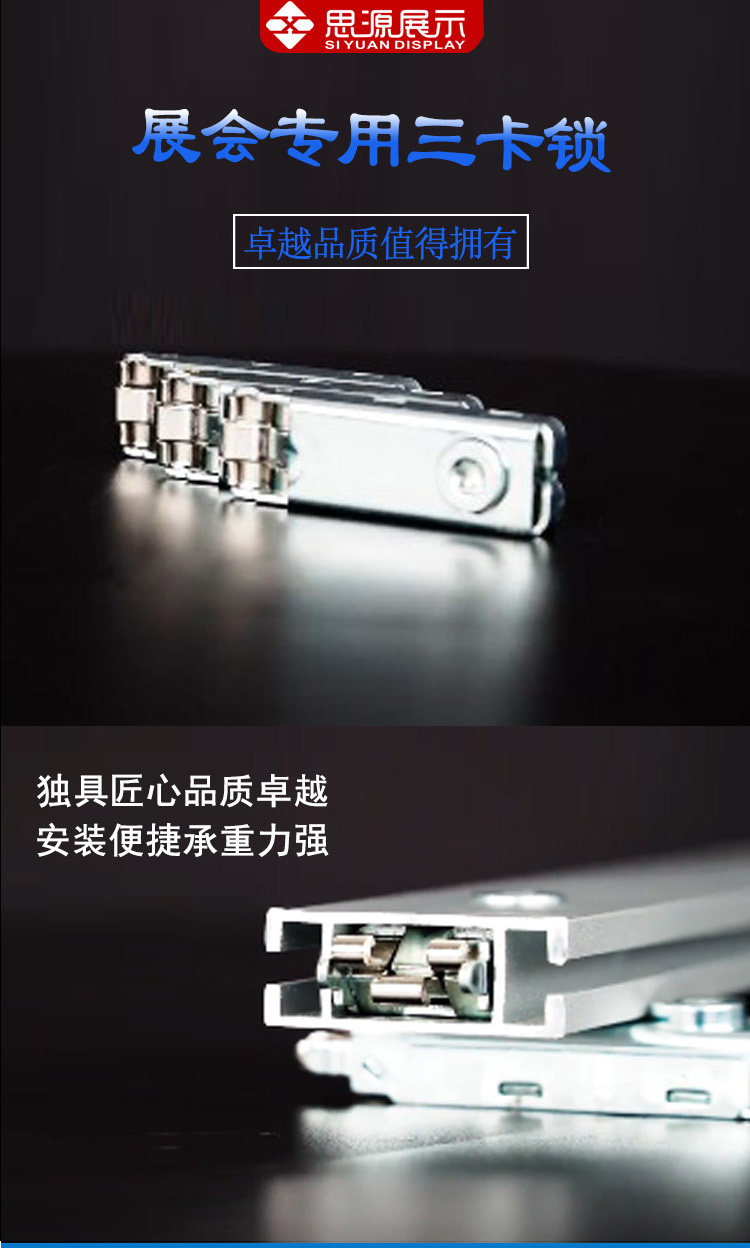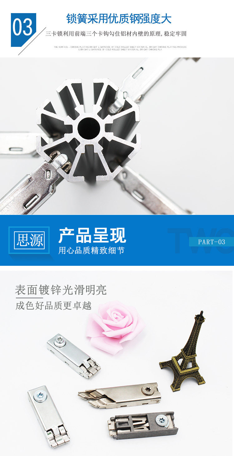 Трехкарточный замок в основном используется для выставочных площадок, и строится связь между различными типами профилей.Он соединяет два алюминиевых профиля с различной ориентацией двух направлений перекрытия, разных концов или одинаковых, и подключается друг к другу, вставляя застрявшие на застрявших когтях канавки профиля.Замок - это пружинный фильм.весна,Эксцентричное колесо.Крышка.Пять частей нижней крышки,Разумная структура.Добро,Легко использовать,Размер соответствует отраслевым стандартам.Весенний лист использует импортированную весеннюю сталь в Западной Германии высокой высокой,После того, как плесень правят,Обработка с помощью передового процесса тепловой обработки,Точный размер,Нет деформации,Имеет хорошую силу и эластичный предел с высокой вязкостью,Высокая интенсивность усталости и модуль упругого полюса.кPВращение традиционного кулачка управляет вертикальным движением пружин,Избегайте явления блокировки,Гарантировать твердость деталей блокировки,Весенний лист имеет большую степень напряжения,Убедитесь, что алюминиевый профиль не поврежден.