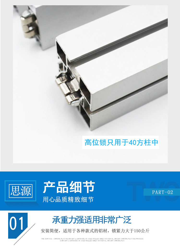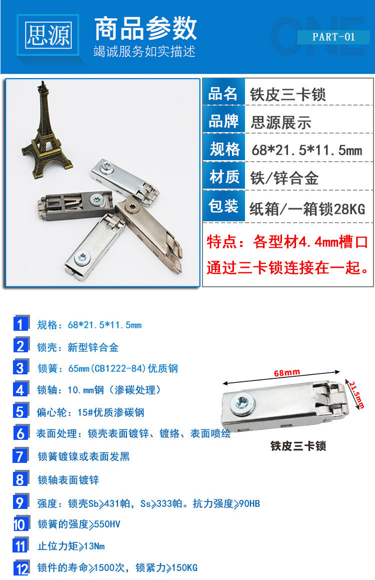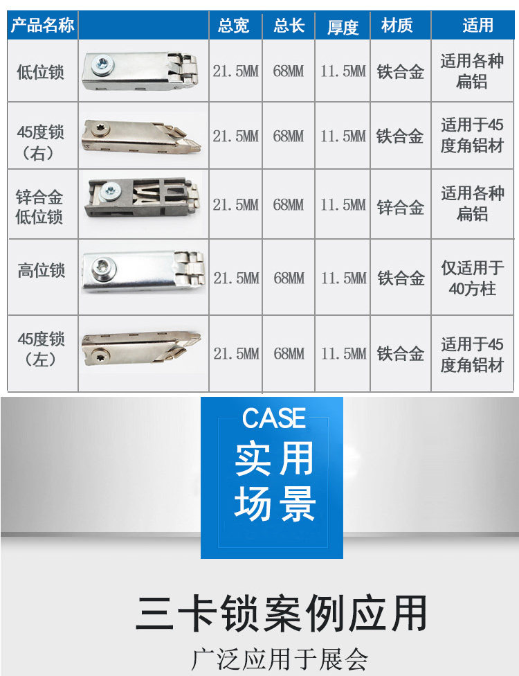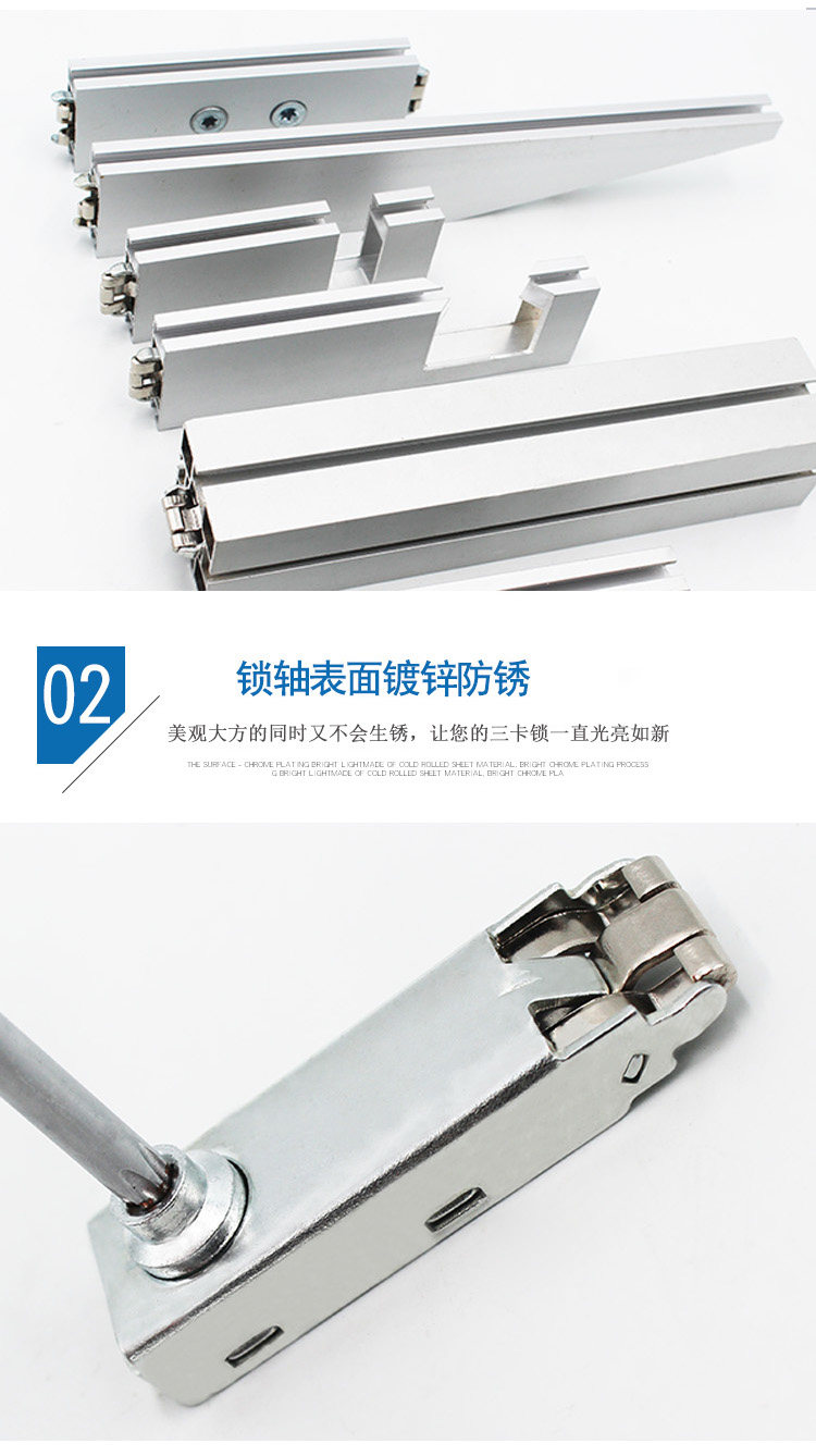 Трехкарточный замок в основном используется для выставочных площадок, и строится связь между различными типами профилей.Он соединяет два алюминиевых профиля с различной ориентацией двух направлений перекрытия, разных концов или одинаковых, и подключается друг к другу, вставляя застрявшие на застрявших когтях канавки профиля.Замок - это пружинный фильм.весна,Эксцентричное колесо.Крышка.Пять частей нижней крышки,Разумная структура.Добро,Легко использовать,Размер соответствует отраслевым стандартам.Весенний лист использует импортированную весеннюю сталь в Западной Германии высокой высокой,После того, как плесень правят,Обработка с помощью передового процесса тепловой обработки,Точный размер,Нет деформации,Имеет хорошую силу и эластичный предел с высокой вязкостью,Высокая интенсивность усталости и модуль упругого полюса.кPВращение традиционного кулачка управляет вертикальным движением пружин,Избегайте явления блокировки,Гарантировать твердость деталей блокировки,Весенний лист имеет большую степень напряжения,Убедитесь, что алюминиевый профиль не поврежден.