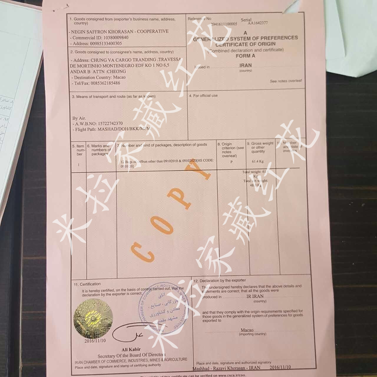 Сертификат происхождения (каждый должен распознать эти сертификаты при покупке шафрана)