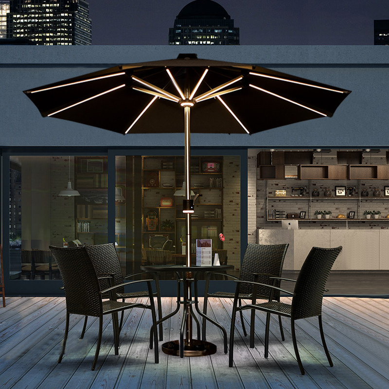 Столы на открытом воздухе и стулья с зонтиком в середине пирога