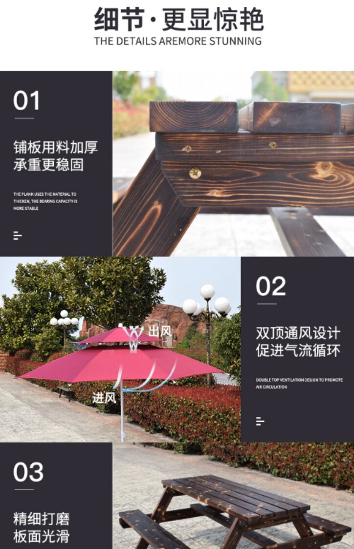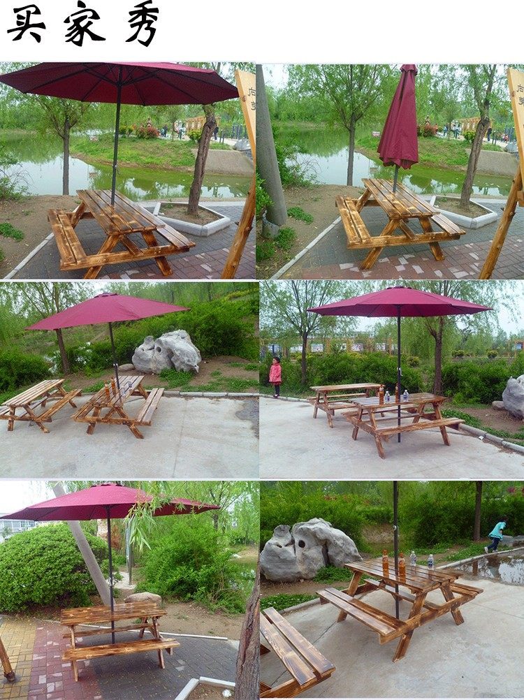 Столы на открытом воздухе и стул Комбинированные кофейни для молока для кафетерия на открытом воздухе, соединенное обеденное столовое кресло с зонтичным парком твердым древесином, антикоррозив