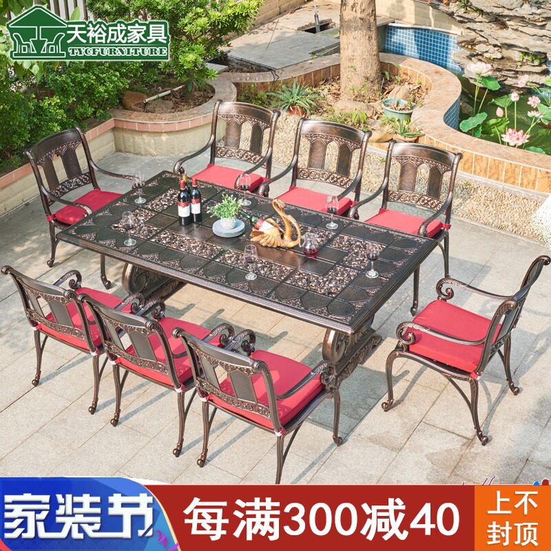 Столы и стулья из литого алюминия на открытом воздухе, открытый балкон во внутреннем дворе, столы и стулья для отдыха, комбинация обеденного стола и стульев на террасе в саду виллы