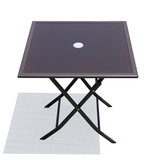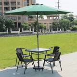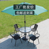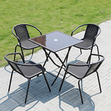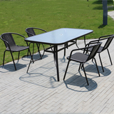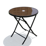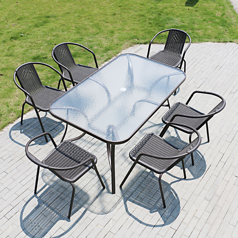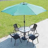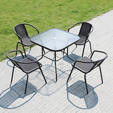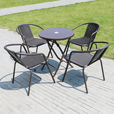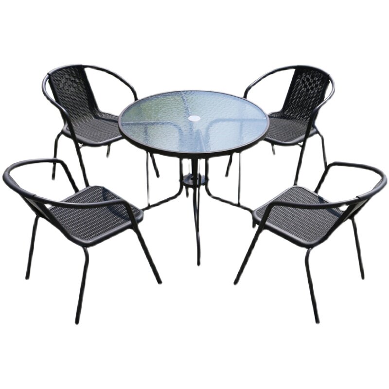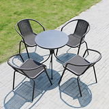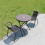 На открытом железном столе, стул и зонтик с молочным чай