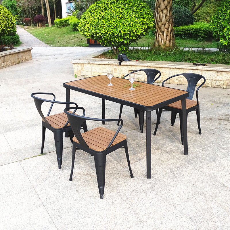 Столы на открытом воздухе и стульев Комбинированные балконы столы и стулья, водонепроницаемый солнцезащитный крем, деревянный стул, железный наружный стул, три или пять сетов