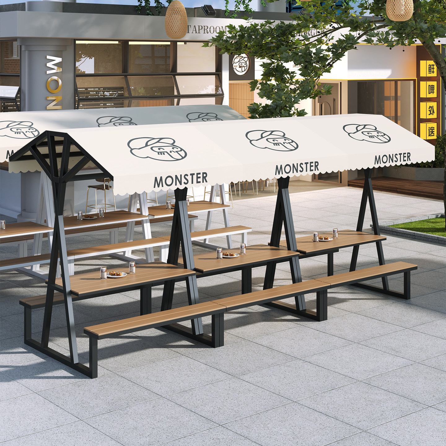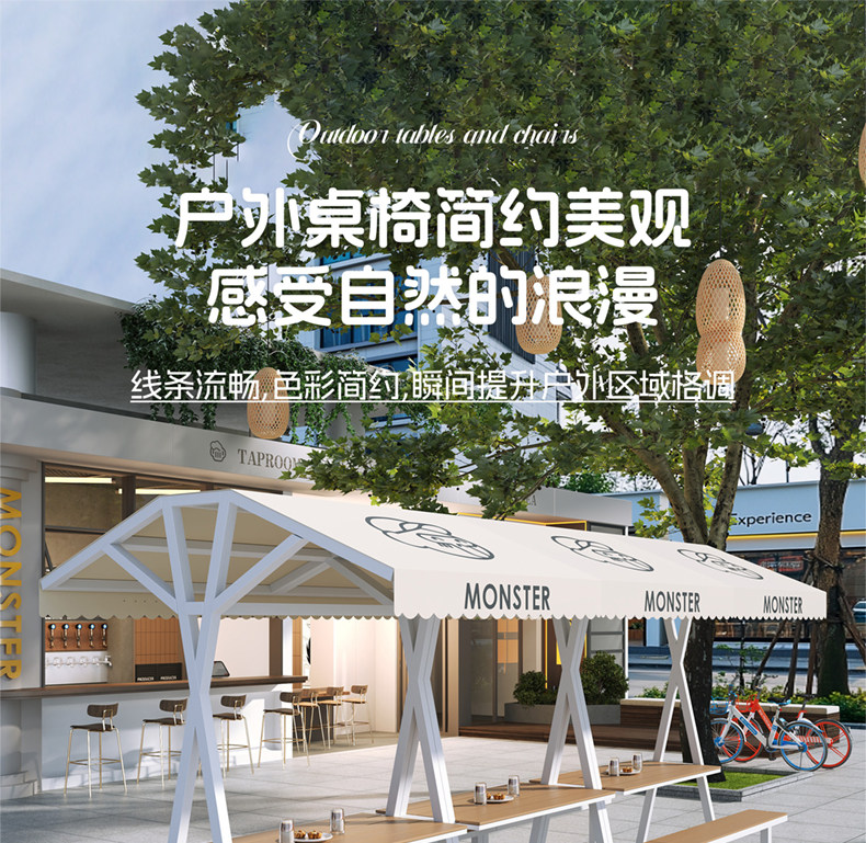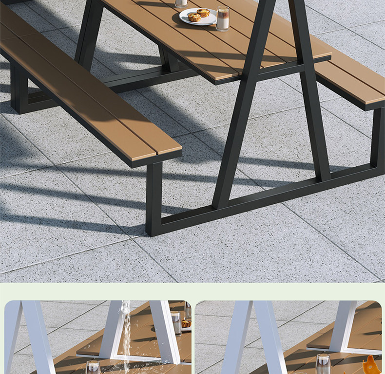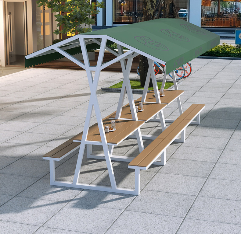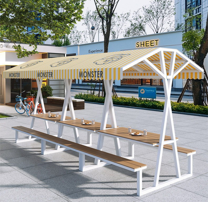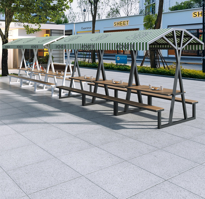 Длинные столы и стулья для улицы, комбинация столов и стульев для отдыха на открытом воздухе, улица с едой, торговая улица, столы и стулья для отдыха, столы и стулья для кемпинга