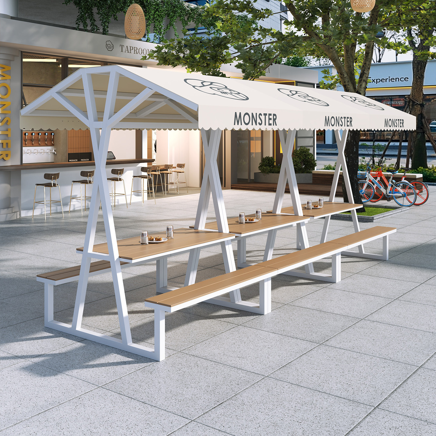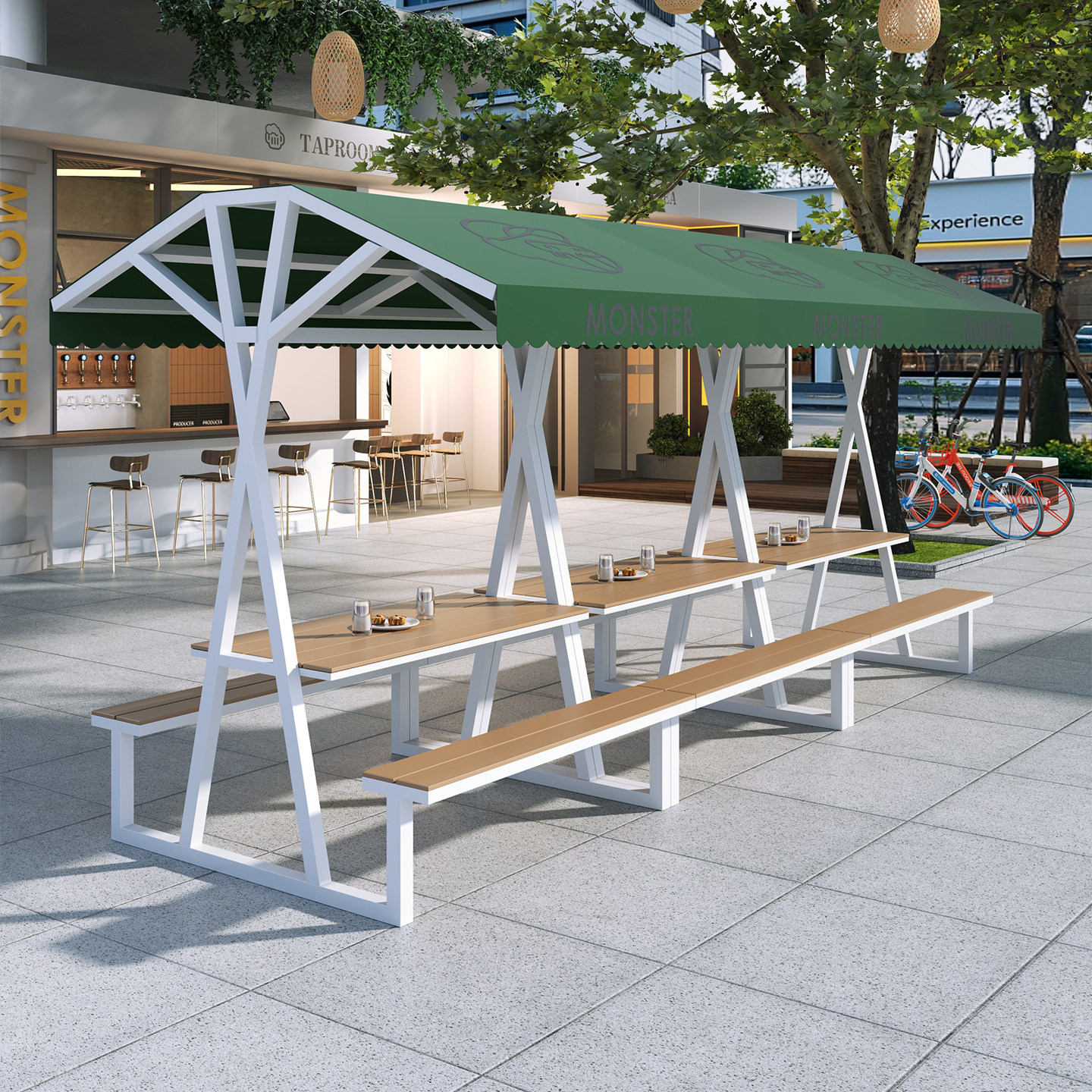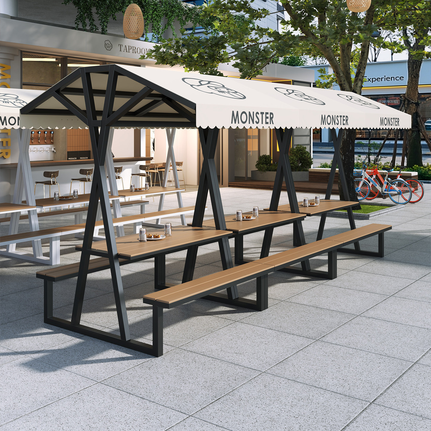 Длинные столы и стулья для улицы, комбинация столов и стульев для отдыха на открытом воздухе, улица с едой, торговая улица, столы и стулья для отдыха, столы и стулья для кемпинга