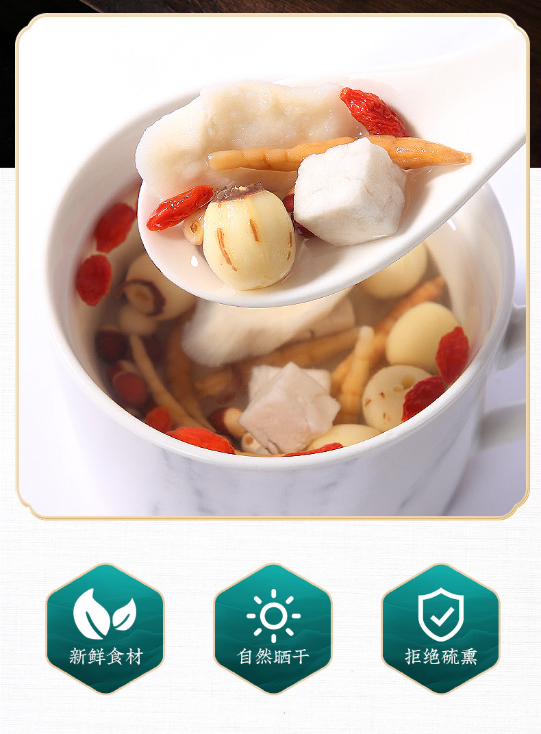 Отвар Сишен, китайские лекарственные материалы, семена лотоса, семена Горгоны, ямс, кокосовые орехи Poria, Radix Pseudostellariae, кожура мандарина, суп из боярышника, недетская селезенка и укрепление желудка.