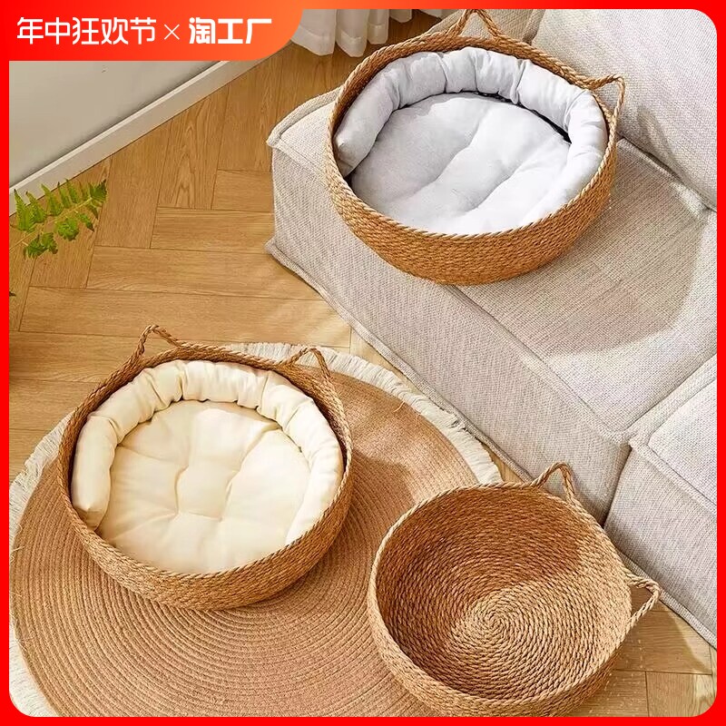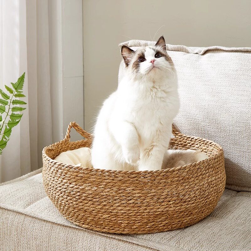 Кошачье гнездо на все времена года, летом из ротанга, съемная и моющаяся соломенная кровать для домашних животных, летнее прохладное гнездо, прикроватное спальное гнездо для кошек