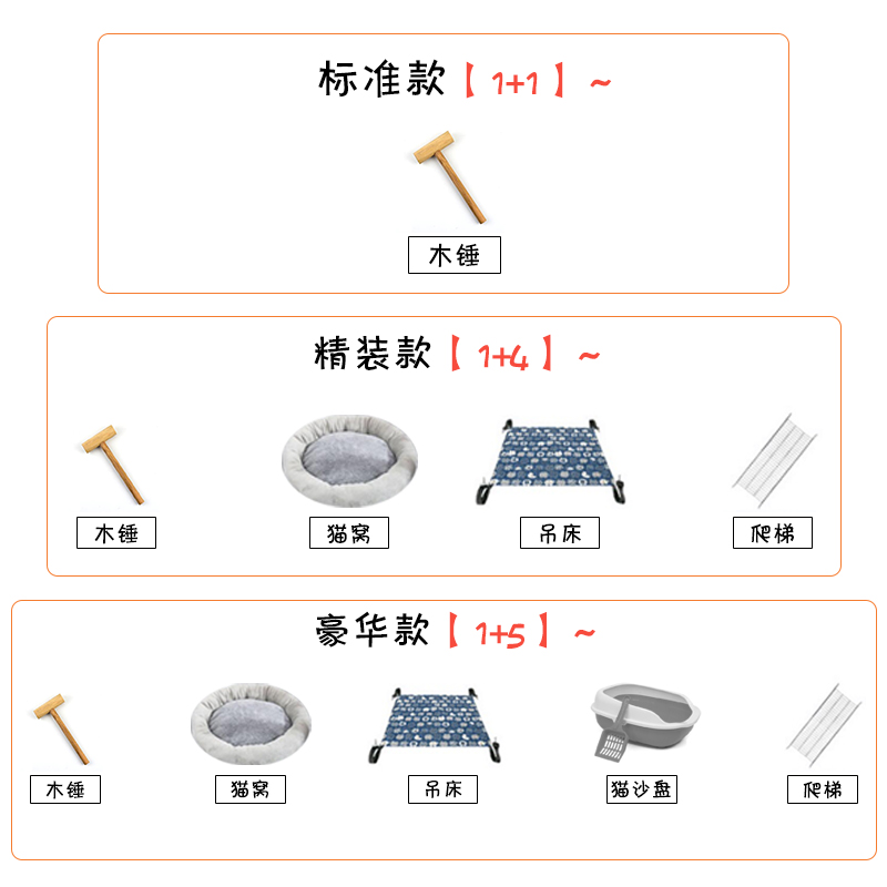 | Применимый размер: | Стандартная модель (пустая клетка+инструмент установки), Модель в твердом переплете (стандартная модель+кошачьи гнездо+подвеска+лестница), Роскошные модели (стандартная модель+кошачьи гнезда+гамак+лестница+кошачья песчаная лопата), Высшая модель (стандартная модель+кошачьи гнезда+гамак+лестница+кошачья песчаная лопата+кошачья чаша) |