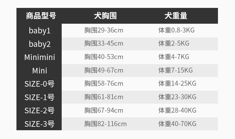 | Применимый размер: | Size0 весит 14-25 кг, Размер 1 вес 23-30 кг, Размер 2 вес 28-40 кг, Размер3 весит 40-70 кг |