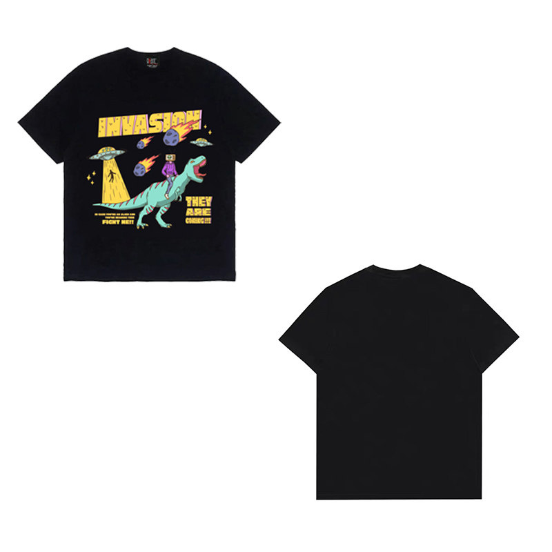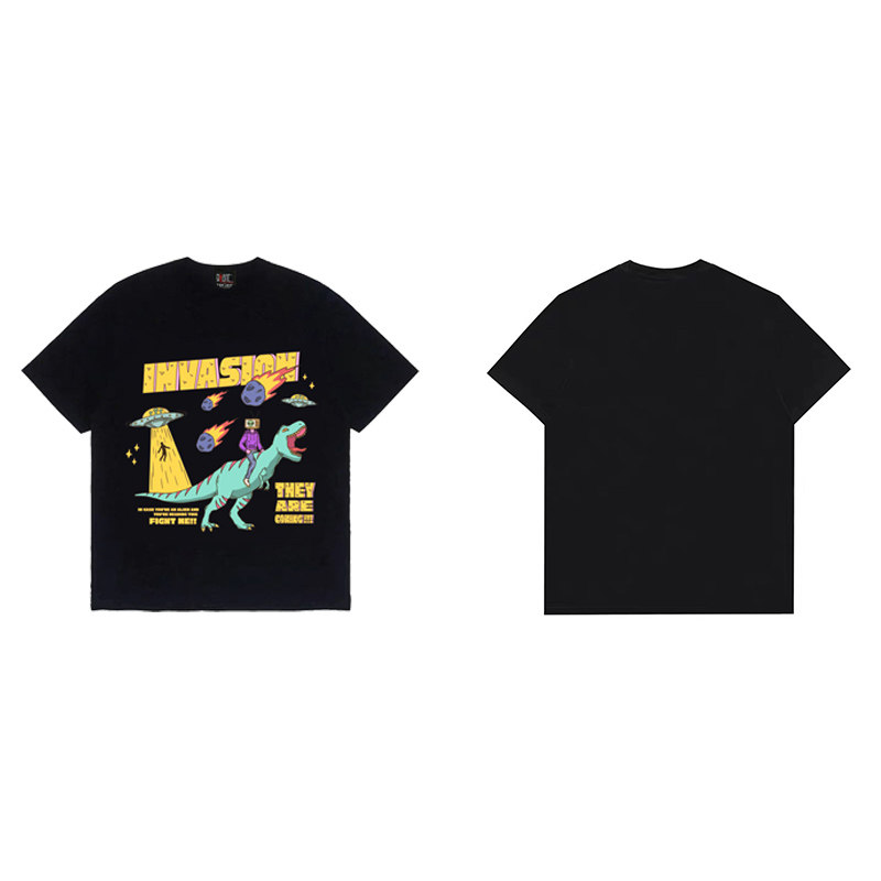 Tide, ретро черная мультяшная футболка с круглым воротником подходит для мужчин и женщин, в американском стиле, короткий рукав, принт, оверсайз