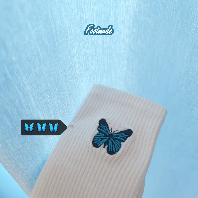 Вышивка с бабочкой, белые лазурные носки подходит для мужчин и женщин, с вышивкой, средней длины, популярно в интернете